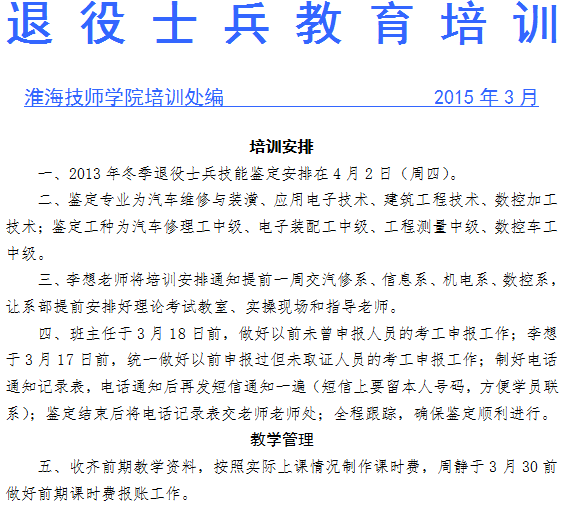 2015年3月份退役士兵教育培训工作安排