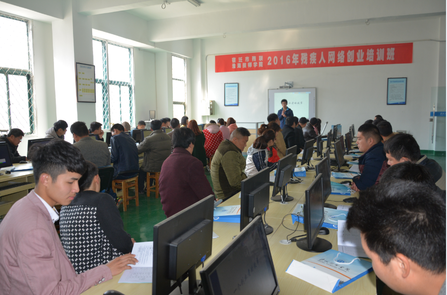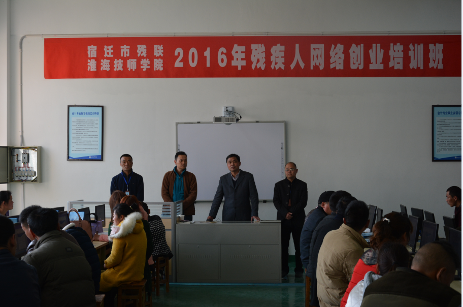 本次培训是自宿迁市残疾人联合会和我院签署战略合作伙伴关系以来共同举办的首次培训班,在开班仪式上,市残联就业管理中心主任吴长志殷切希望残疾人学员们自强自立,着力提升创业能力。他希望各位学员:一要提高认识,树立信心。虽然大家被身体的原因加上了“残疾”的字眼,但你们思维开阔,干事创业的信心和决心应该更大。我们大力倡导大众创业、万众创新,出台了免费培训等鼓励和支持残疾人创业就业的政策,所以,希望大家能迅速转换角色,沉下心来,认真学习,主动接受新知识;二要珍惜机会,刻苦学习。大家要安心参加网络创业培训学习,还要优化环境,共同营造紧张活泼,温暖如家的学习环境,希望学员们严格遵守学习纪律,按时上下课,不迟到、不早退,保持课堂纪律,要通过学习,找准自己的人生定位和奋斗方向;三要学以致用,科学创业。大家要持续学习,量力而行,诚实守信,开拓创新,回报社会,争取带动更多的残疾人创业就业。我院副院长胡柯要求培训处切实做好后勤保障,安排好教学、饮食和住宿,培训教师要认真准备授课内容,将实用的内容教给学员,同时也希望各位学员要珍惜学习机会,遵守培训制度,做到学有所获,学以致用。