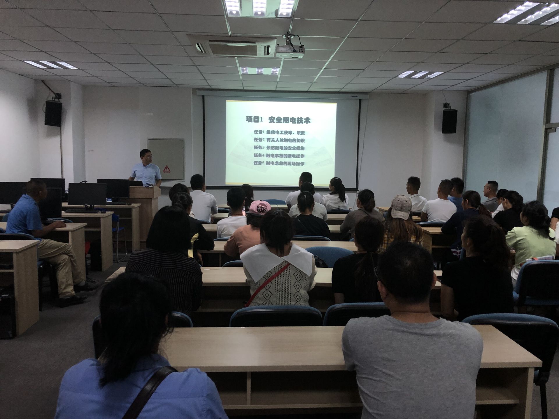此次培训旨在提高园区下岗失业人员再就业能力,增强其就业意识,促进其再就业。为做好此次培训工作,我院提前制定授课计划、细化授课内容,培训教师主要围绕维修电工的岗位职责、人体触电的知识、预防触电的安全措施、触电事故的断电操作、触电急救的现场操作等五个任务模块展开授课。