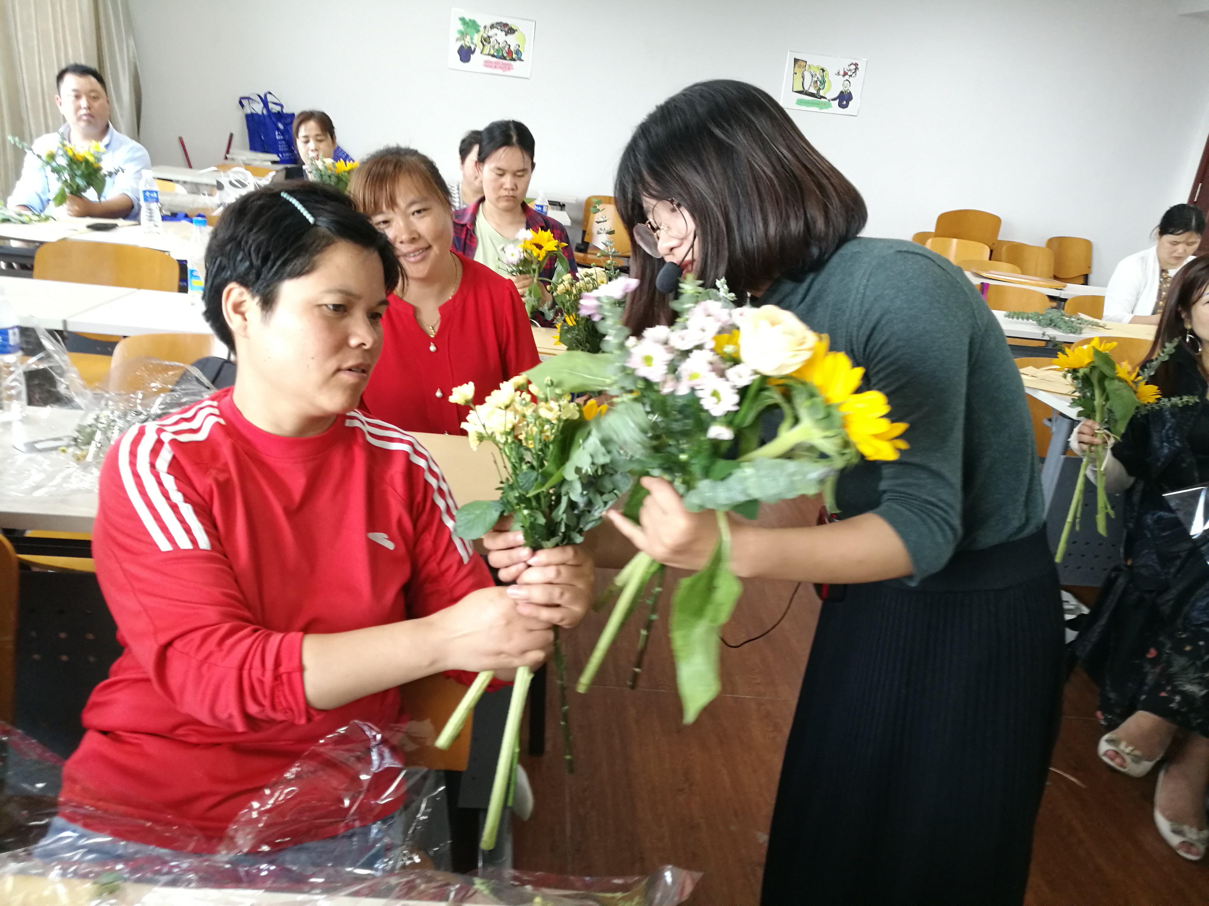 培训结束后,各个学员手里都有一束漂亮的鲜花,学员们表示:很高兴能参加这次培训,学会了简单的插花,可以把家里装饰的更加漂亮!