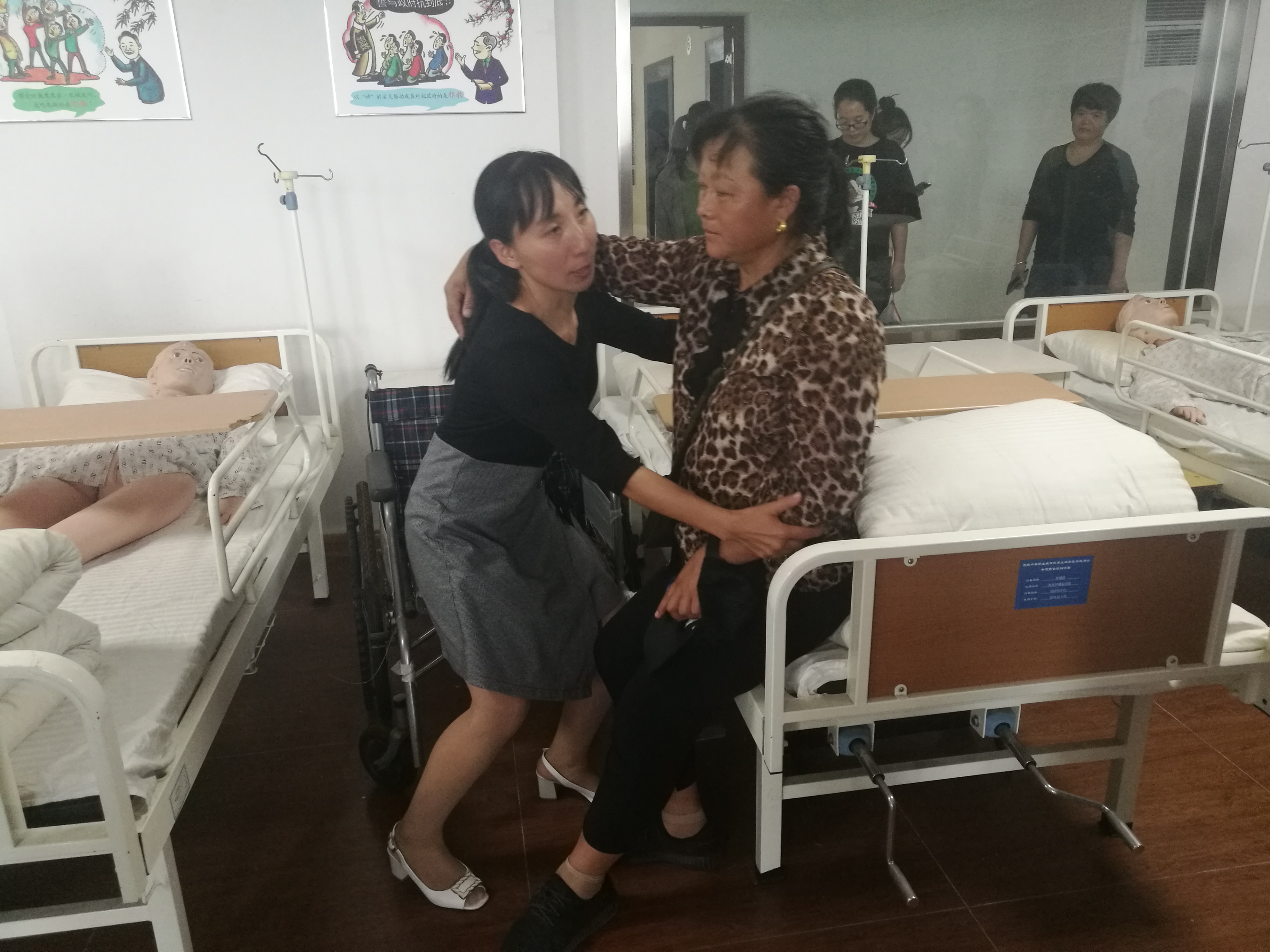 技能实操课上,培训教师现场示范如何将行动不便的老人从床上移到轮椅上,边操作边讲授动作要领和注意事项,学员们认真观察、记录,随后分组练习,培训达到了预期效果。
