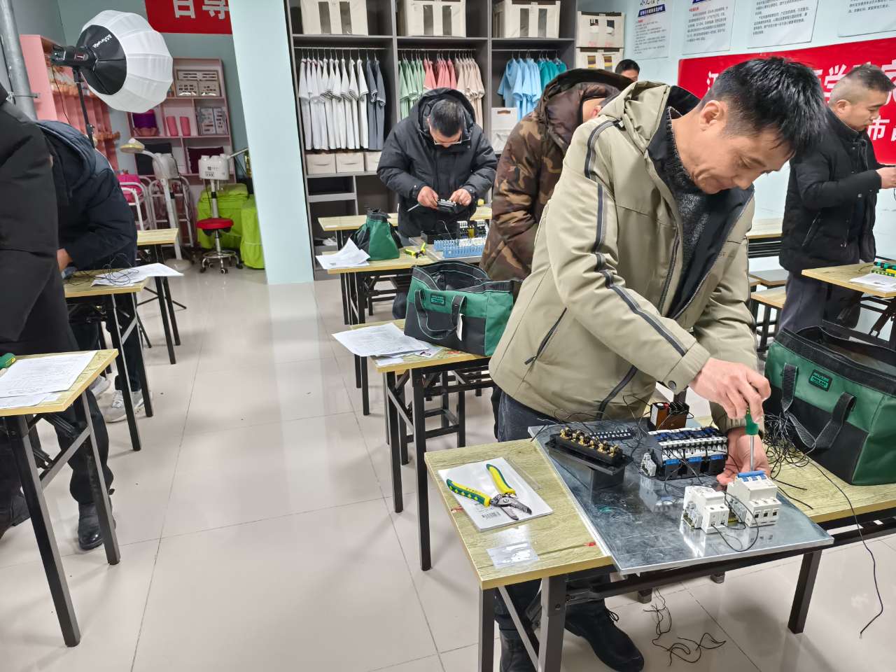 为了规范考试流程,我院秉承“科学规范、公平公正”的原则和“做人为本、技能立身”的理念,组织督导员和考评员开展考前培训会。考试分理论和实操两部分,重点考察考生的电工安全基本知识、配电及电气照明安装操作、电气设备维护及常见故障处理、触电急救操作等知识和技能。