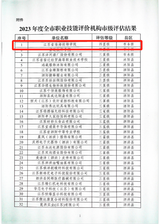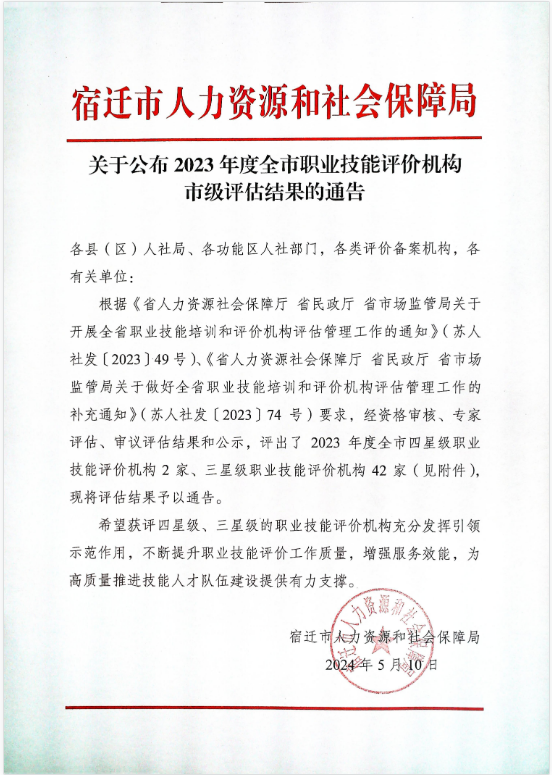 近日,市人社局公布2023年度全市职业技能评价机构市级评估结果,我院获评四星级职业技能评价机构。这一荣誉不仅是对我院在技能人才评价工作方面努力的认可,也是对我院整体工作的肯定。