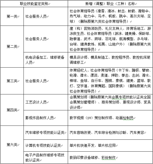 二、鉴于《通知》规定的原第六类体育指导员已分别调整为第一、二、三类社会服务人员;原第六类会展专项技能认证类全国会展策划管理师取消,在第四类增加会展策划师(已列入本通知公布的新增(调整)职业(工种)技能鉴定类别表中),现同时公布取消原职业(工种)技能鉴定分类。