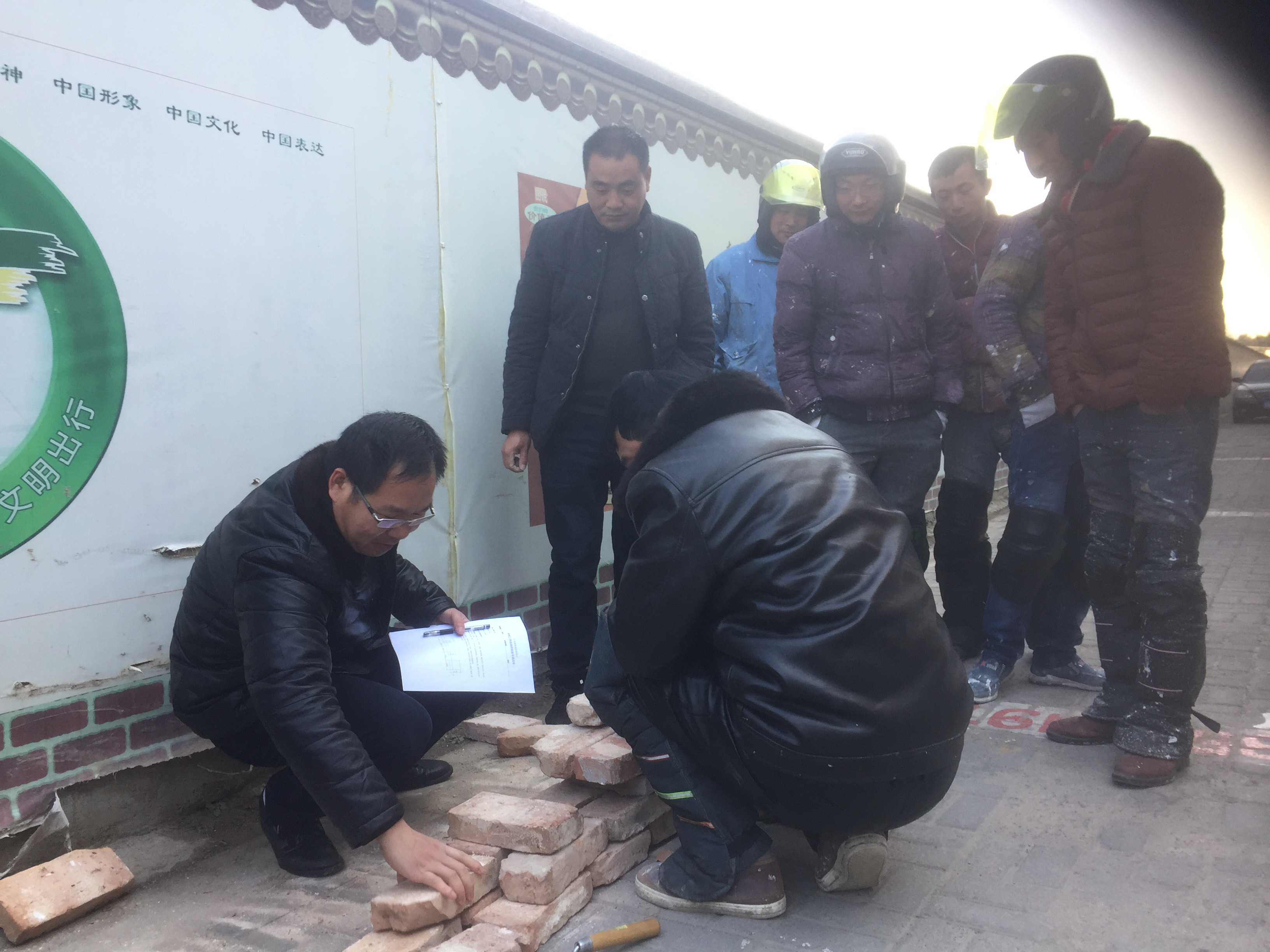 考试分为理论考试和操作考试两部分。本次鉴定考试以基本的砌筑技术和原理出发,对学员进行理论和实操的考核。聘请建筑行业考评员根据学员的实际操作情况,现场打分,评定学员的操作水平。同时向学员们指导讲解砌砖的平整度、垂直度、灰缝的饱满等相关专业知识,对操作不当的学员,现场分析原因,提出改进方法。
