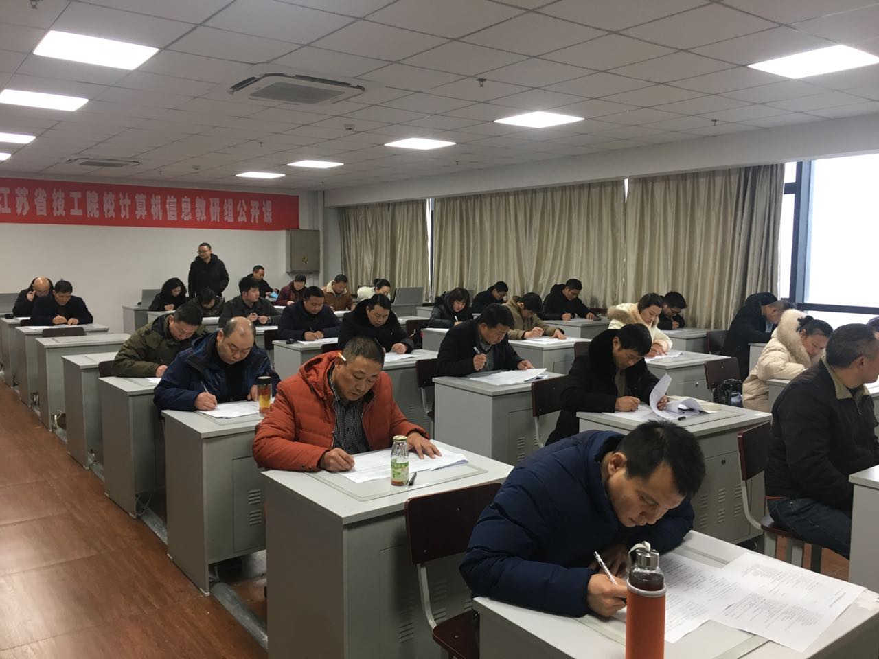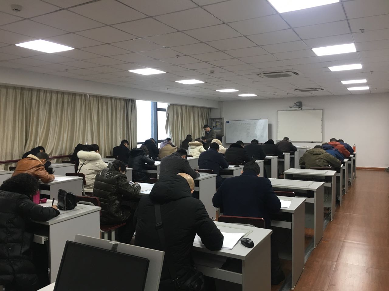 我院受宿迁市人社局工考办委托,承接了南京理工大学2017级专业证书班学员的培训及教学工作。经过两年多培训学习,2017级专业证书班“信息技术与管理”和“汽车维护与管理”两个专业共计38名学员迎来了结业考试。由于该班学员皆为各事业单位工作人员,为了不影响他们的正常工作,我院利用周末时间组织了结业考试。