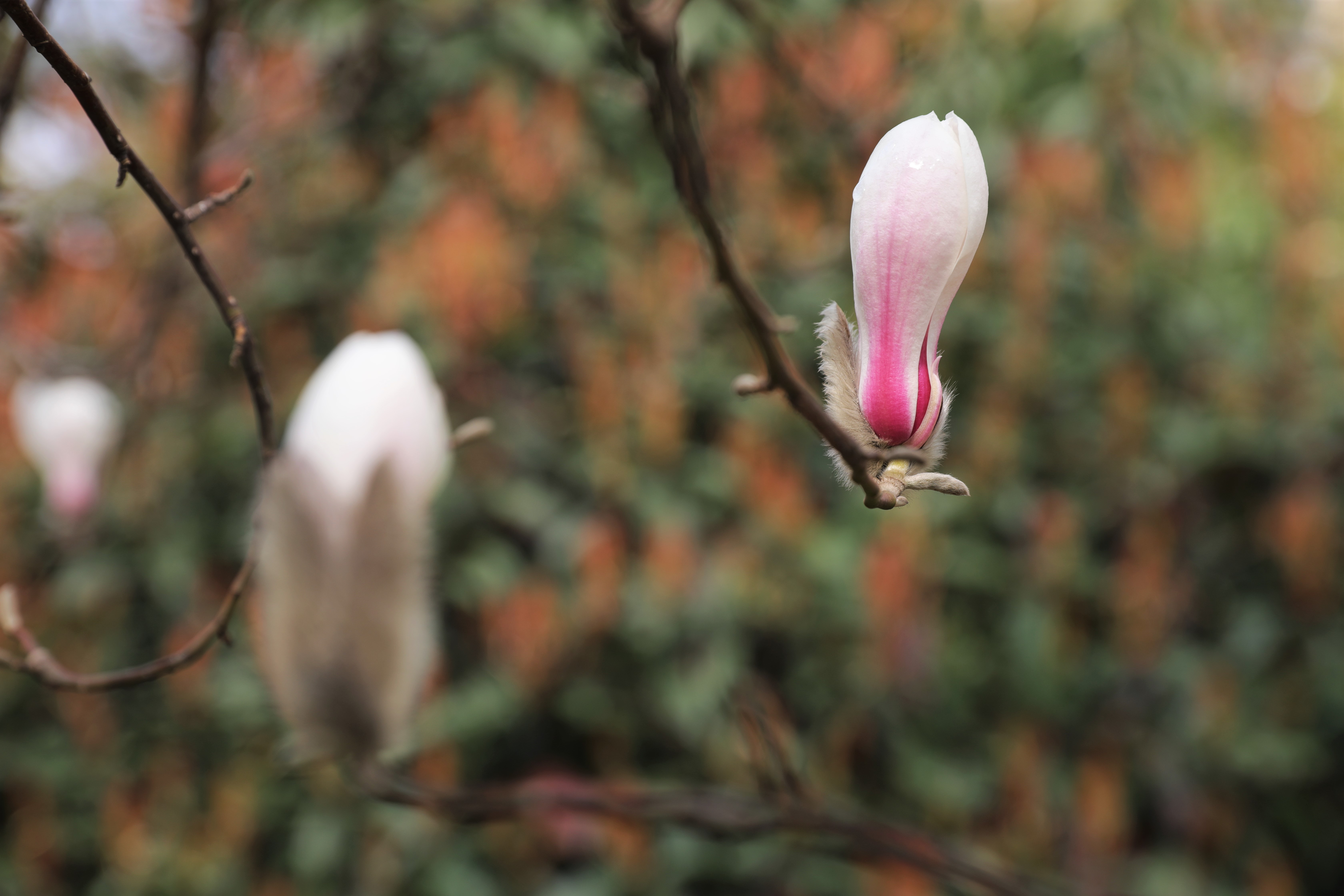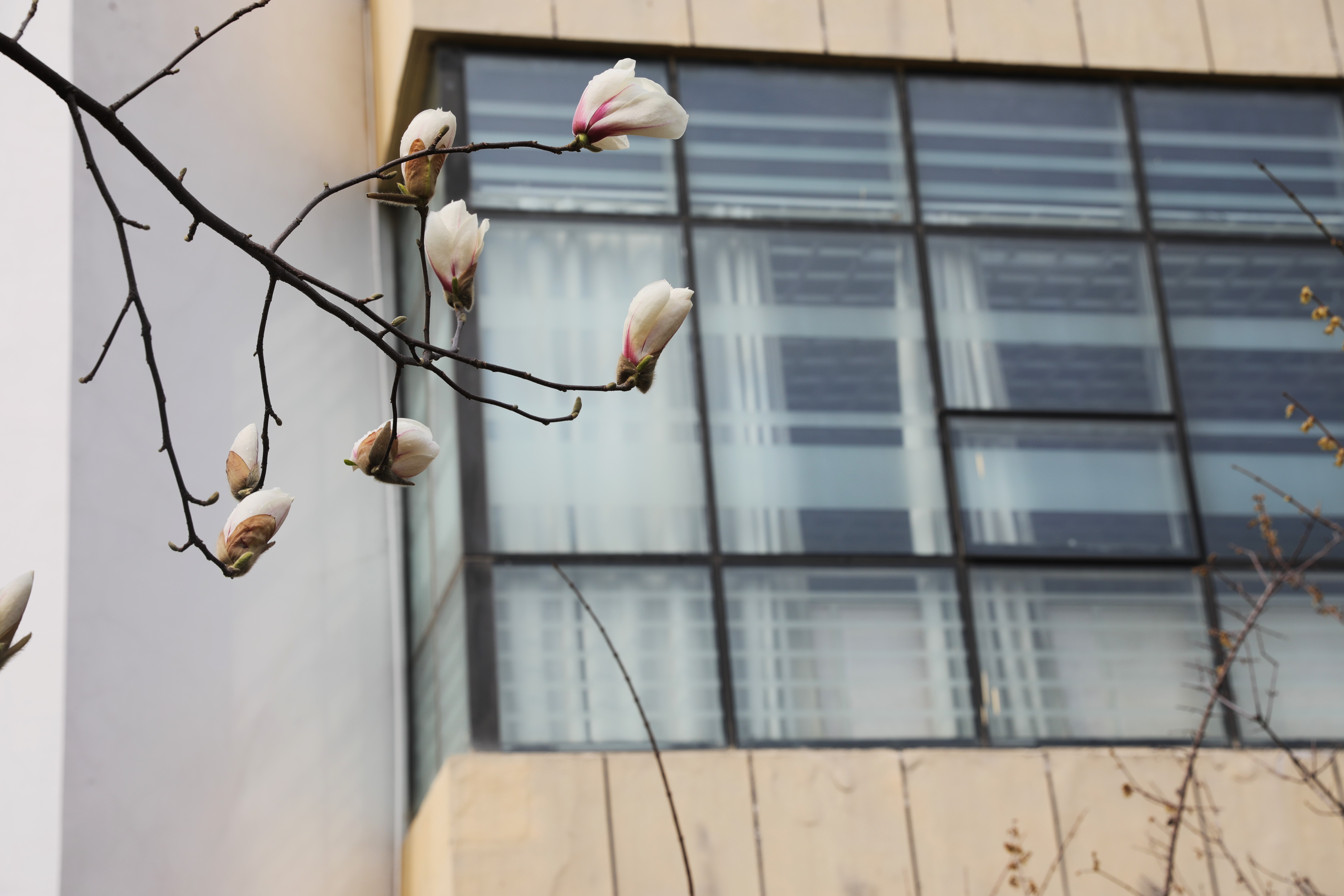 玉兰花朵各个向上而开,如玉碗亦似琉璃灯盏,色彩雅致。它们像是细腻光洁的定窑瓷,烧制时却发生了钧窑的色变,所以底上带了一抹艳丽的紫。抬头遥望,真怕一阵风来,将玉碗吹翻,上演一出“大珠小珠落玉盘”。