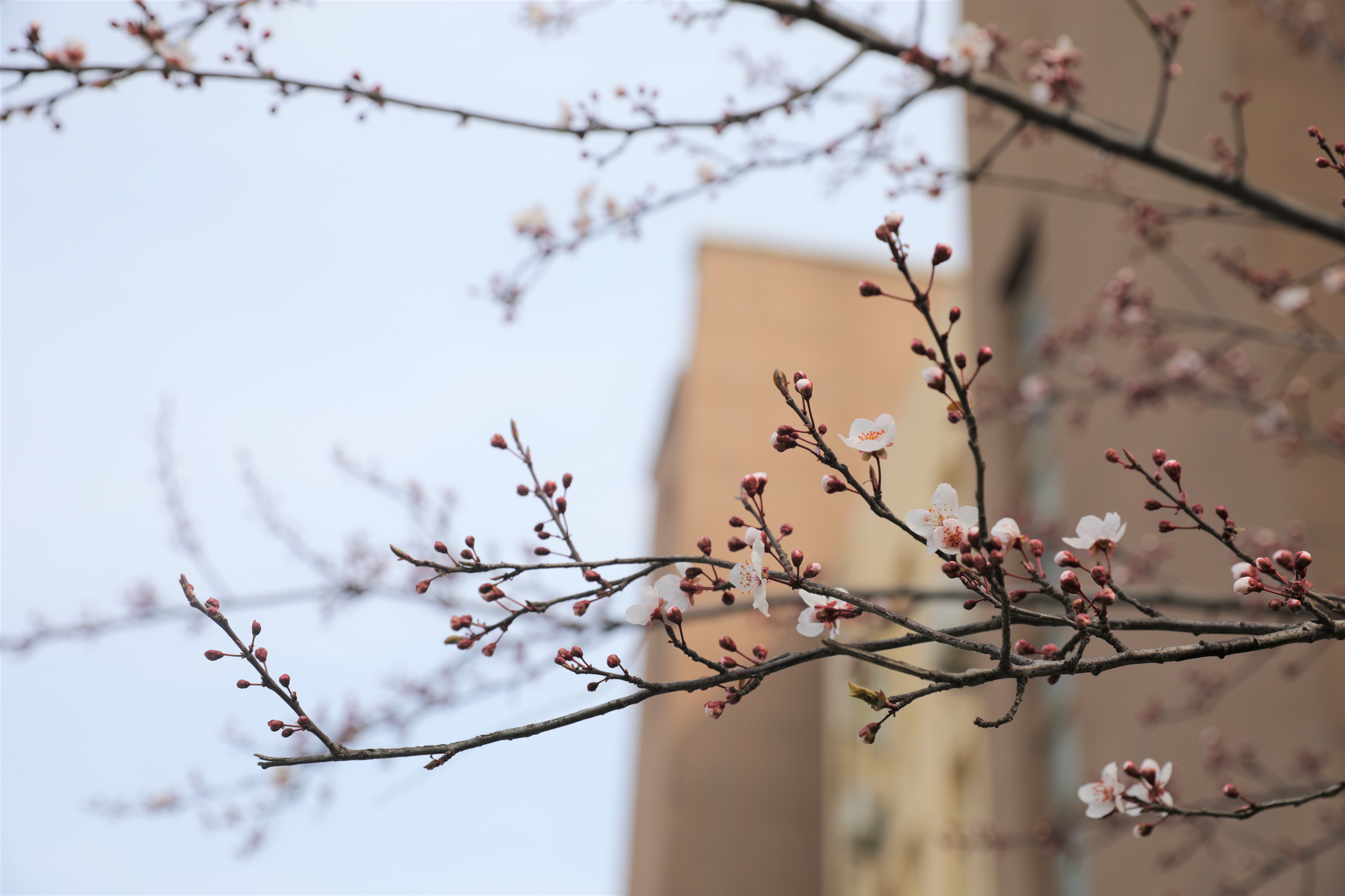 紫叶李是校园里遍布的树种。栽植在敞亮处的,深刻地向我们阐释着什么叫“向阳花木易为春”,而身处阴凉处的植株,疏落枝条自然而然地一伸,却也独有别样的韵味儿。