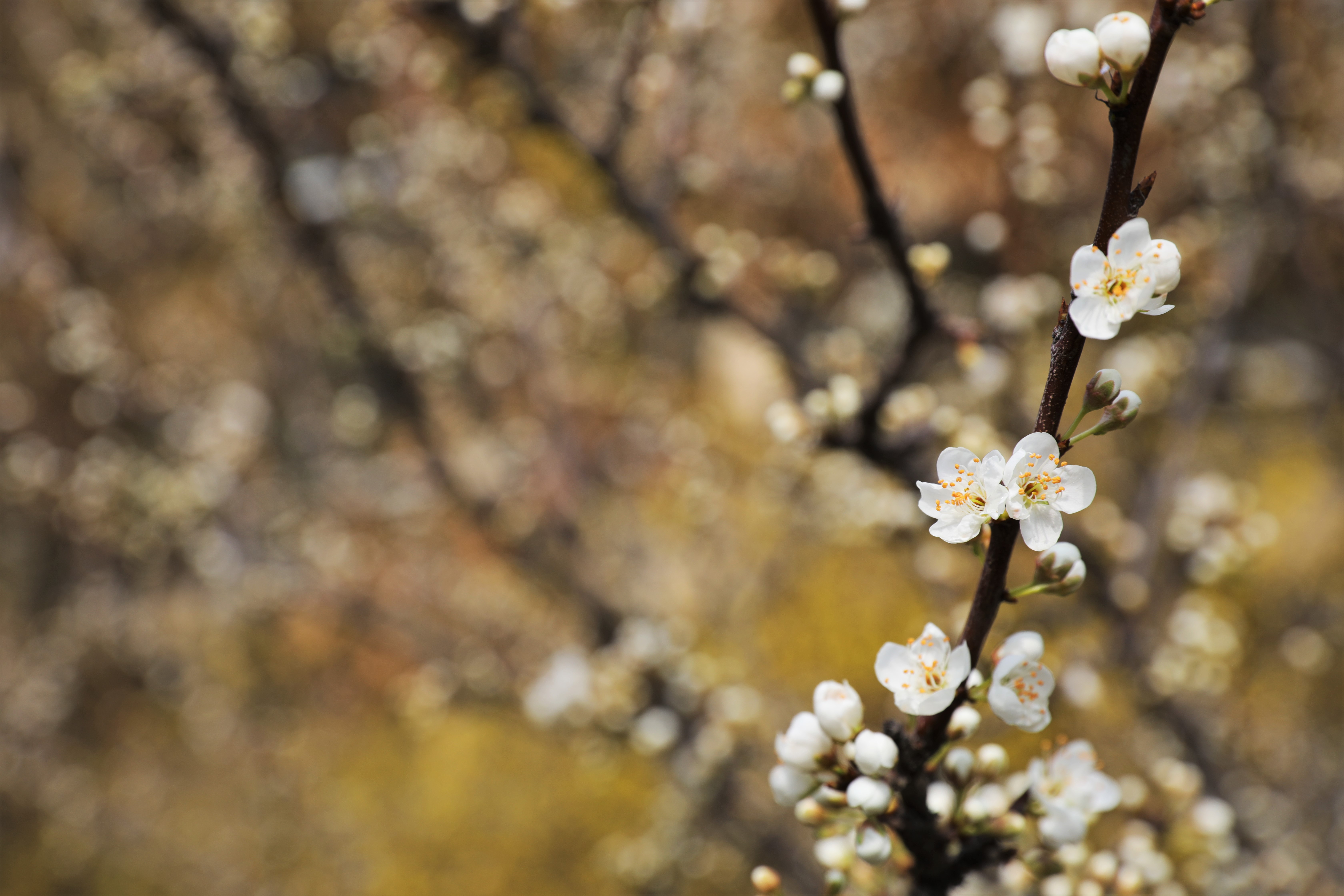 白色李花虽然多数仍只是含苞,但是像珍珠一样的骨朵儿已然缀满了枝头。寻访其间,乍见几朵敞开门户的,都不由得让人心生惊喜。可以想见,再过些时日,它们一定会开起热闹的联欢会了。