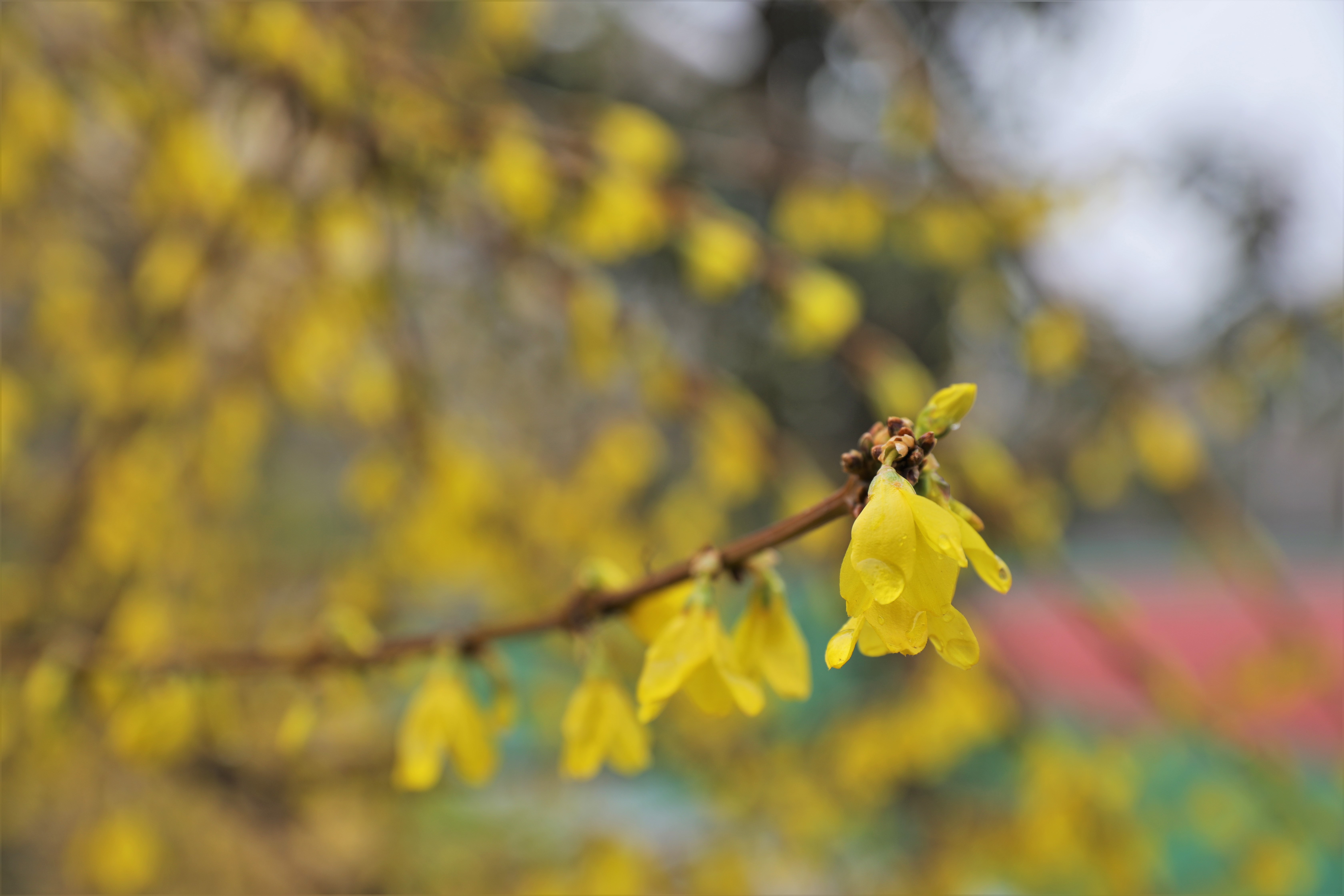 金黄的迎春喇叭腔小声大,用最嘹亮的声音告诉人们春天真的来了。操场边角的不起眼处,成团成簇的迎春花,高傲地展示着它那明黄的高贵色彩,让料峭春风从中穿过后,似乎也沾染了几丝温暖。