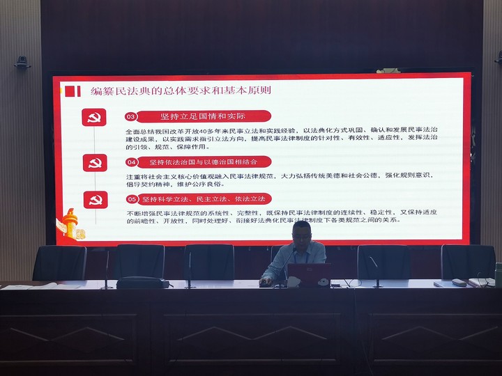 首先,培训处党支部书记郭宜勇从总体上介绍了《民法典》的主要内容,提出编纂民法典是党的十八届四中全会提出的重大立法任务,是以习近平同志为核心的党中央作出的重大法治建设部署。他系统阐述了民法典的重大意义,带领学生深入回顾民法典的编纂历程,深刻概括民法典的鲜明特色,立体布局民法典的全面实施,全面部署民法典的普法工作,明确提出民法典的理论研究。结合社会实际、学生年龄及心理特点,以及发生在身边的多个真实典型案例进行了深入浅出地讲解。
