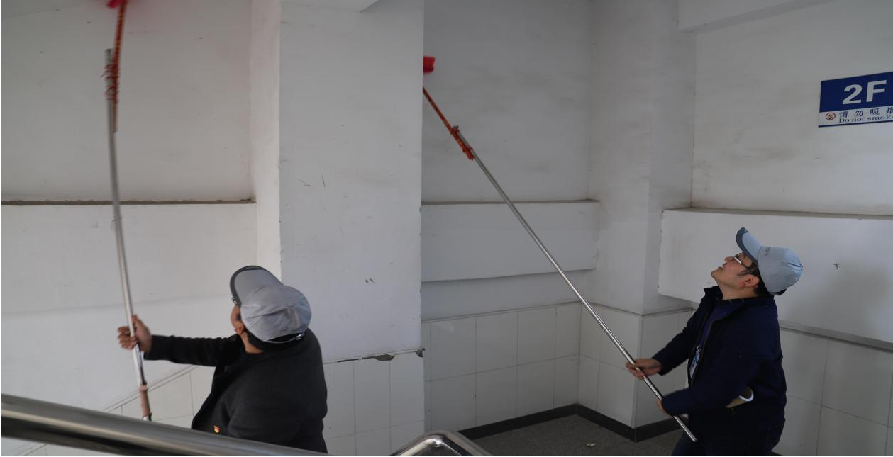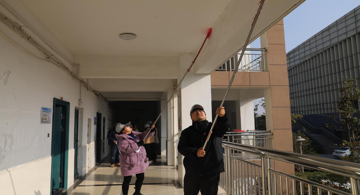 活动中,同志们拿起改装过的扫帚、垃圾夹、垃圾桶分别对教学楼教室、走廊、楼梯等各角落进行认真打扫,清除杂物、蜘蛛网等,并对教室、走廊物品进行调整,让整个教学楼焕然一新。