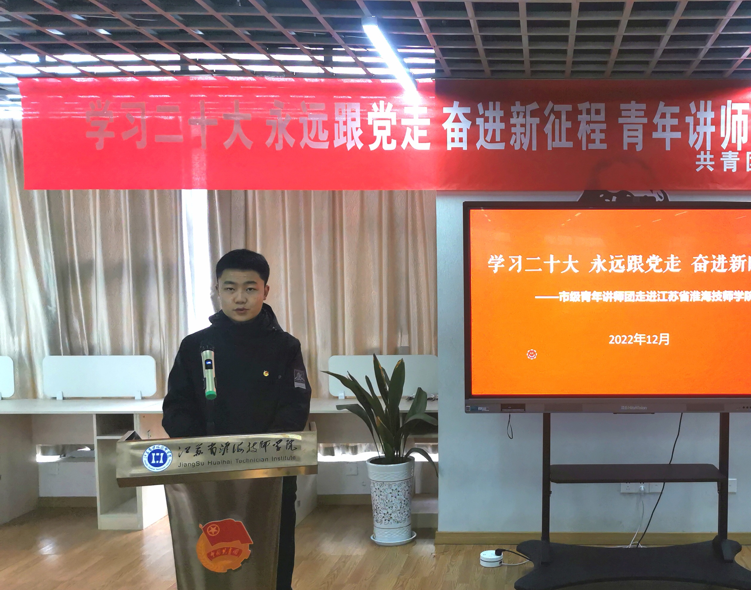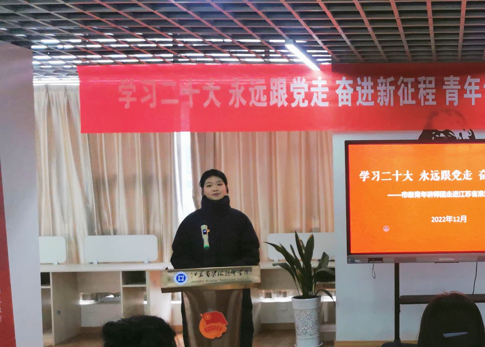 宣讲活动中,全国优秀共青团团员、学院青年教师单延驰,江苏省最美职校生、淮小青志愿者汤婷婷分别结合自身实际分享了党的二十大精神学习感悟以及个人成长故事。