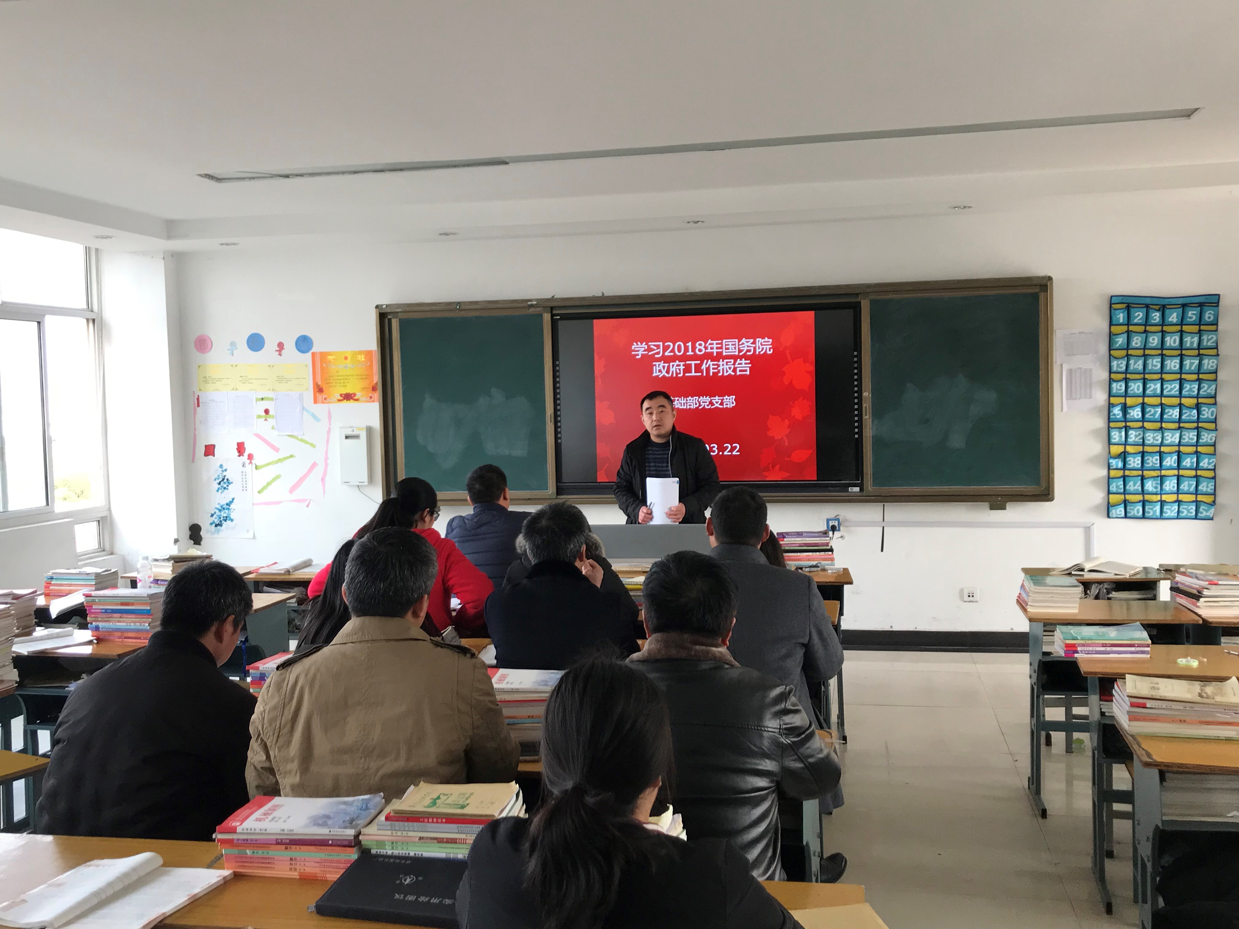 3月22日下午,基础部党支部召开全体党员会议,传达学习学院党委文件精神及2018年政府工作报告。学习会由基础部党支部书记汪啸主持。