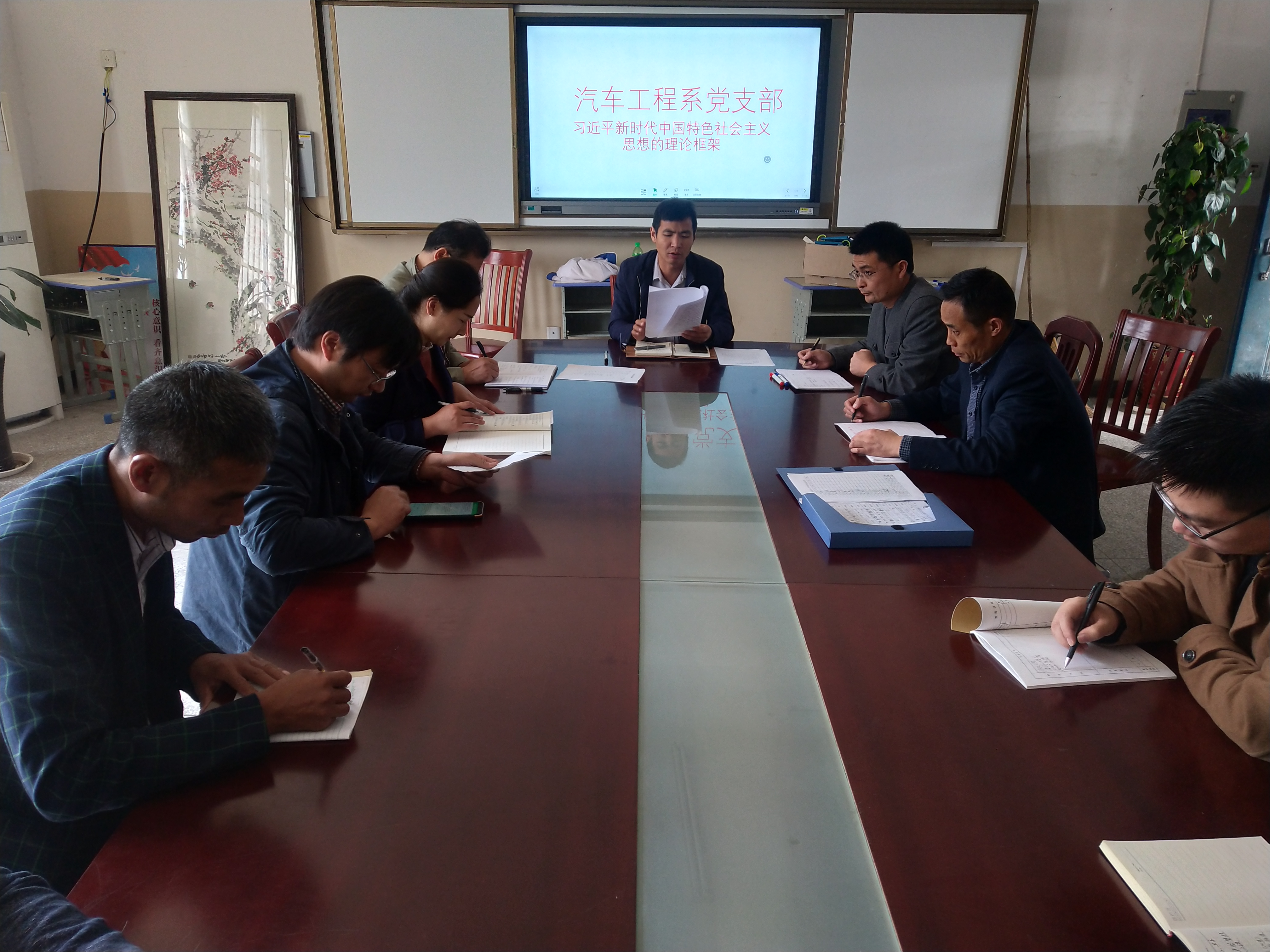 10月19日下午,汽车工程系党支部组织全体党员集中学习习近平新时代中国特色社会主义思想的理论框架。会议由党支部书记陈伟主持,全体党员参会。