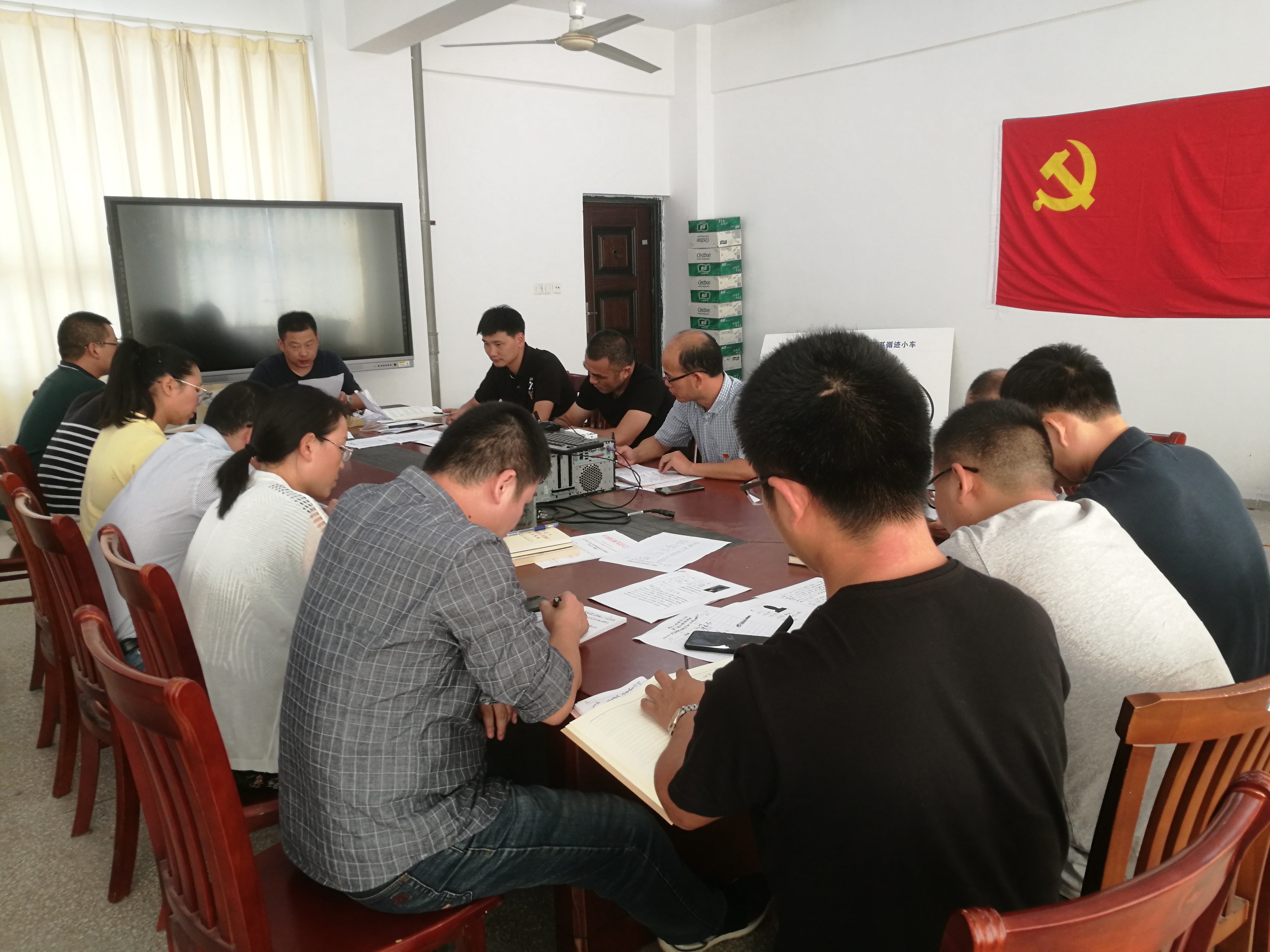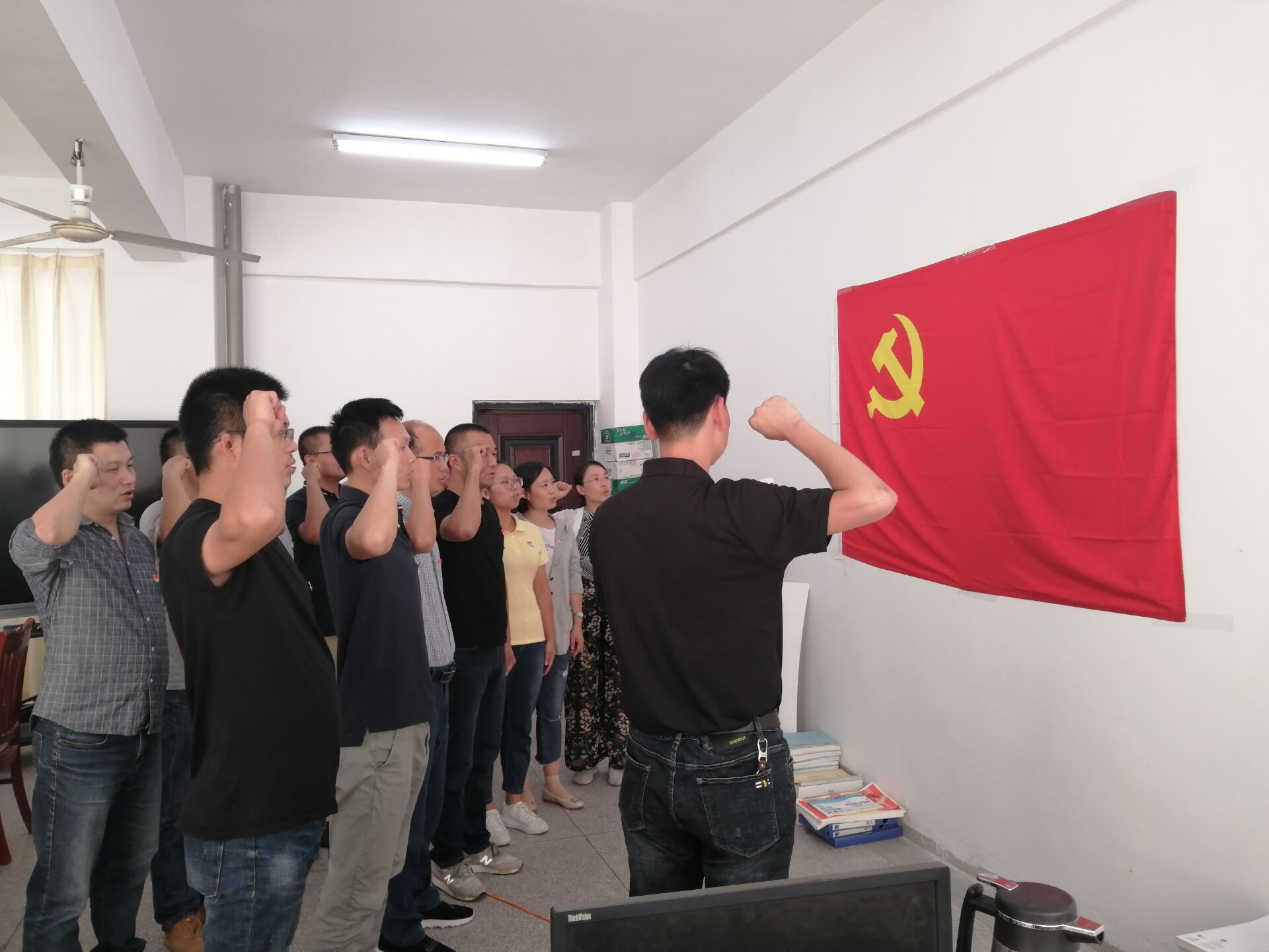 在重温入党誓词阶段,支部全体党员佩戴党徽,面对鲜红党旗重温入党誓词;全体党员重读《入党志愿书》,重忆入党经历和成长历程,对自己入党历程和入党初心进行了回顾、回问和认真剖析,并结合日常工作学习实际亮承诺、亮标准、亮作为。