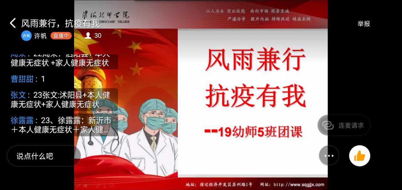 在班主任老师及团支部书记的组织下,各支部同学们通过屏幕共享的方式进行了网络直播团课。直播中,同学们对新冠肺炎有了更进一步的了解,对此次疫情的进程更清楚。明白了在此次情况中自己应该做些什么,怎么才能更好地保护自己。