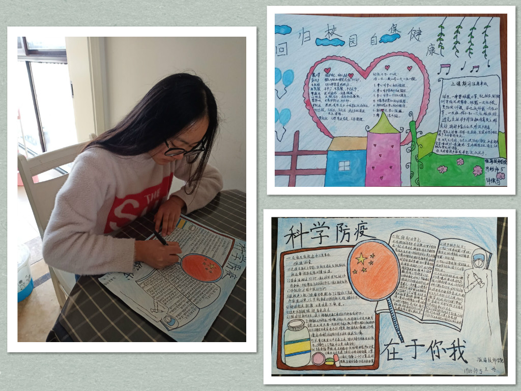 除此之外,同学们还通过歌颂、手抄报、书法绘画等形式向奋战在一线的医护人员和志愿者致敬。在疫情防控的决胜阶段,向所有一线为疫情辛勤工作的医务人员和志愿者致敬,祈祷疫情早日结束,期待早日回归校园。大家通过网络平台向老师汇报了自己如何充实的开展疫情防控期间的学习生活,以及为复学复课所做的充分准备。