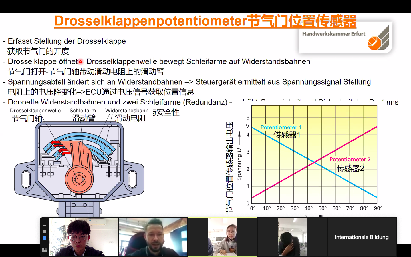 经过与德方线上反复沟通交流,结合系部教学进程表和班级课程表,双方制定中德国际班线上教学计划,德国埃尔福特教育培训中心安排了四位机电一体化高级讲师负责课程设计,编制传感技术、调节技术、基于DIN VDE0100的保护措施、PLC编程、GRAFCET流程图等专业核心项目任务,德国埃尔福特手工业行会安排了两位汽车考官围绕博世系统故障诊断仪的规范使用制定授课计划,教学效果明显。