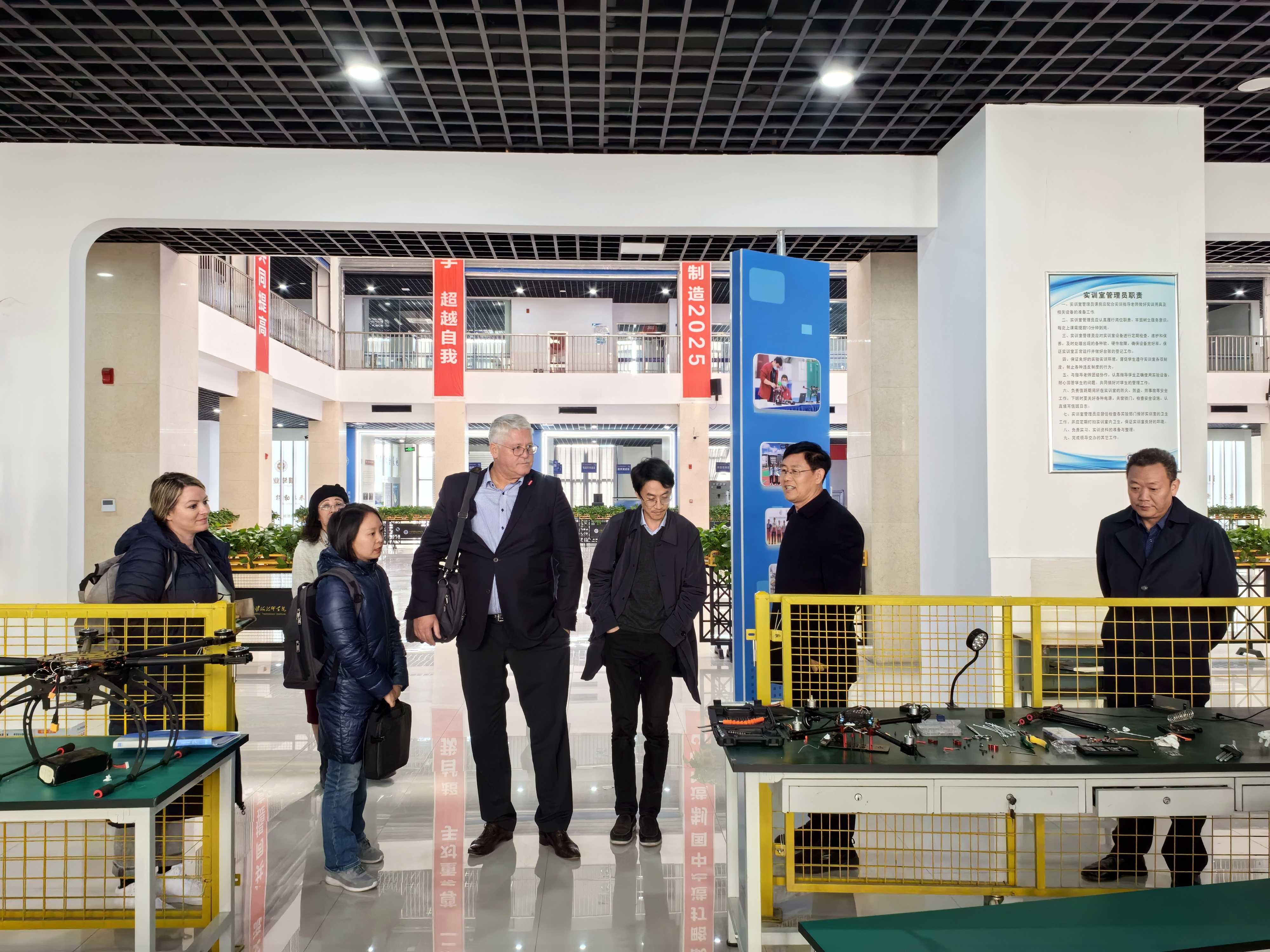 Thomas Malcherek一行依次参观了学院图书馆、校史馆、国家产教融合机器人实训中心、中德学院实训基地,智能制造及新能源汽车实训中心等地,围绕中德合作办学、“金蓝领”高技能人才培训、中德骨干师资培训等项目进行洽谈。