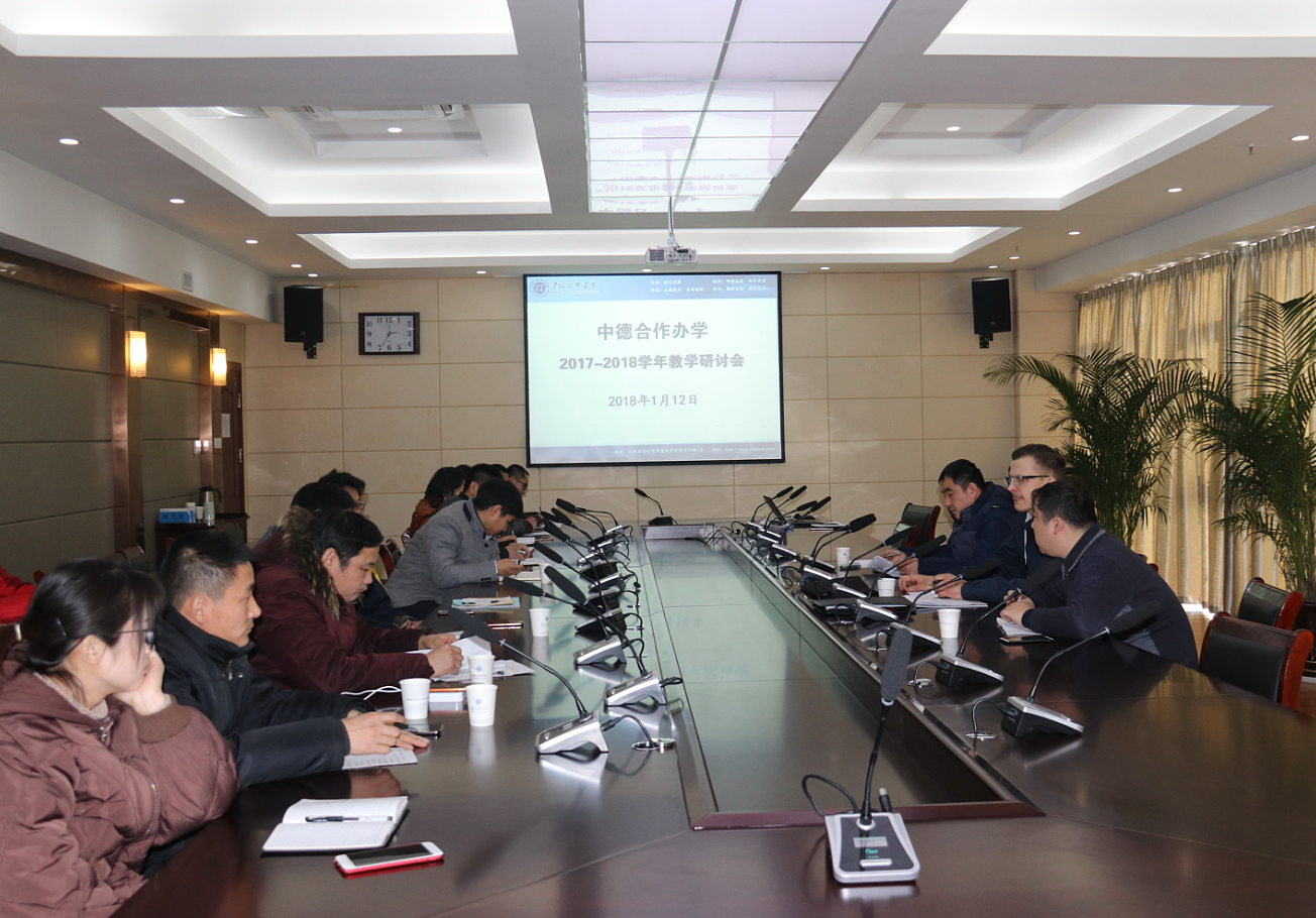 1月12日下午,我院在行知楼九楼会议室组织召开了2017-2018学年第一学期中德合作办学教学研讨会。HWK(德国手工业行会)教学指导及“金蓝领”讲师菲利普•舍勒、中外合作办公室负责人汪啸、汽修系负责人陈伟及中德国际班相关专业教师参会。会议主要围绕HWK教学指导菲利普•舍勒近一周对中德汽修专业教学观摩后的相关意见、实训基地改造指导、中德国际班下学期课程安排三大主题展开研讨。