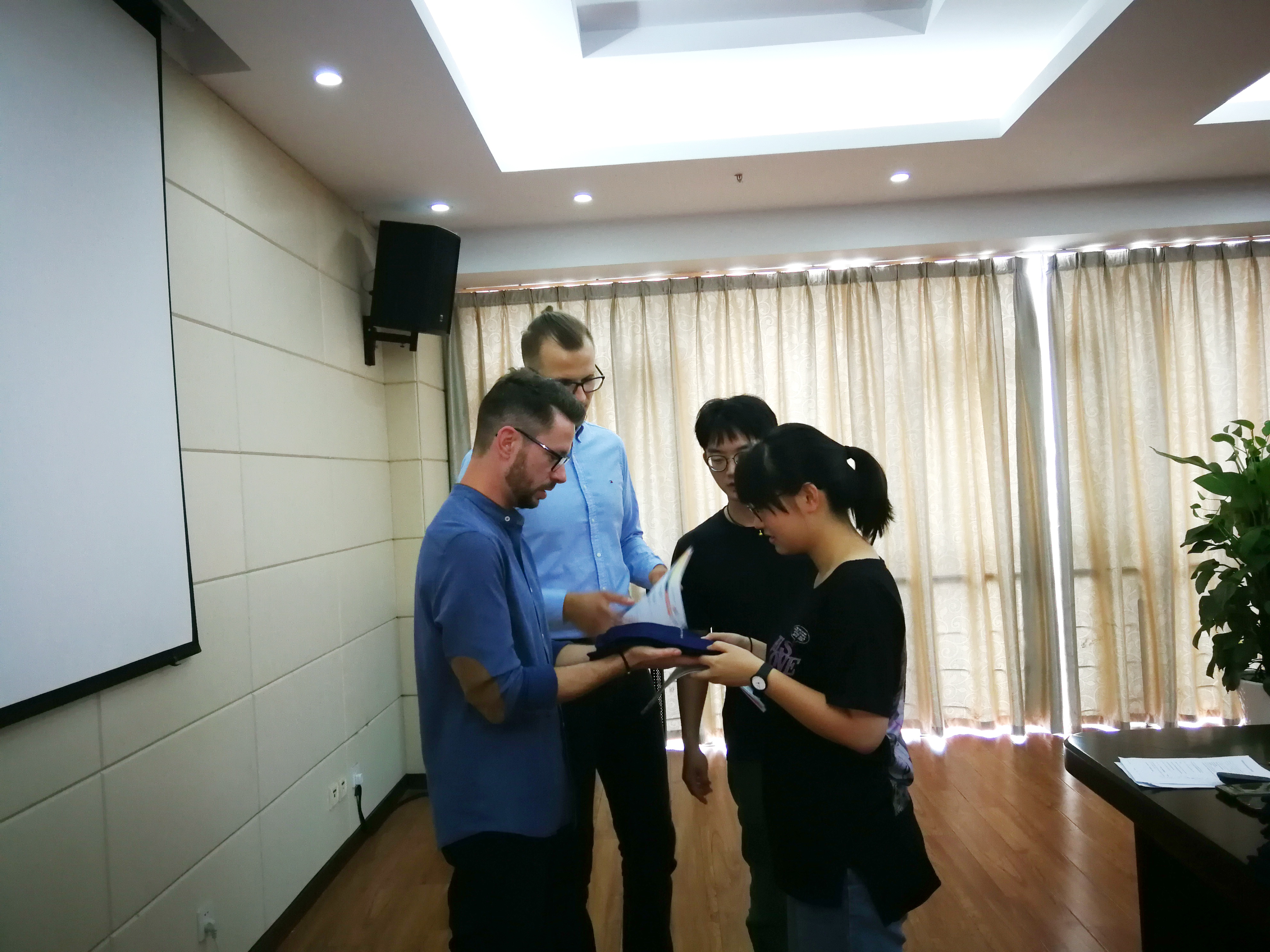 经过近二十天的教学指导及相应考试评估,来自德国的两位专家对同学们的实操表现都给予了肯定,同时也对大家的理论学习提出了更高的要求。针对大家在学习过程中出现的问题,两位专家提出了相应建议。结合同学们的考试表现及阶段性学习成果,两位专家为合格的同学们颁发了相应证书,并为每个同学都准备了精美的T桖衫。
