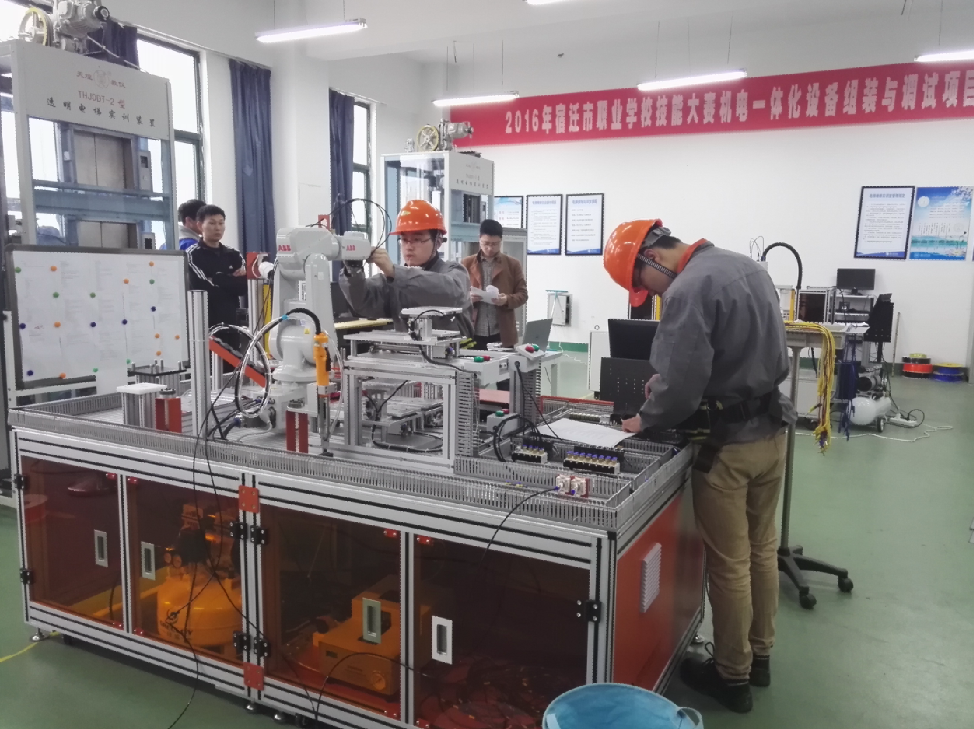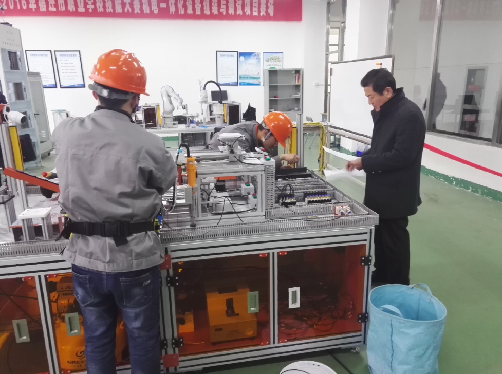 本次竞赛以2017年江苏省职业院校技能大赛机器人技术应用项目样题为标准,考核学生工业机器人课程学习效果。赛项采用团体比赛方式进行,两名参赛选手互相配合,根据竞赛时发给的工作任务书,在4小时内协作完成竞赛任务。包括工业机器人操作、钳工装配、电工电子、PLC应用、气动控制、视觉检测等工作任务,以3C行业典型工艺应用为项目引导,按顺序完成目标产品的制造过程。参赛选手们认真操作,在纷繁复杂的环境中沉下心来,认真应对,全力以赴。