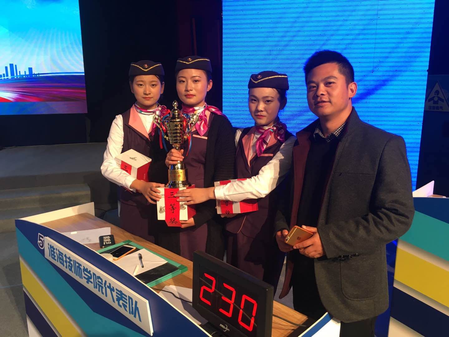 比赛紧张激烈,选手们争分夺秒,“八仙过海,各显神通”,必答题,准备充足,轻松过关;抢答题,你争我抢,寸步不让,一时间抢答器滴滴作响;风险题,大家眉头紧锁,苦思冥想,谨慎作答。最终,三轮比赛以后,成绩随之公布,我院代表队以总分230分的成绩获得了团体三等奖。不仅选手激动万分,拉拉队也瞬间沸腾,“竞速时代,淮海最帅……”振奋有力的口号声响彻演播厅。最后,市质监局副局长李文志、省特检院宿迁分院院长、市特种设备安全协会会长苏静农等主要领导同志为获奖队伍颁发了奖杯、礼品,并与所有参赛队伍合影留念。