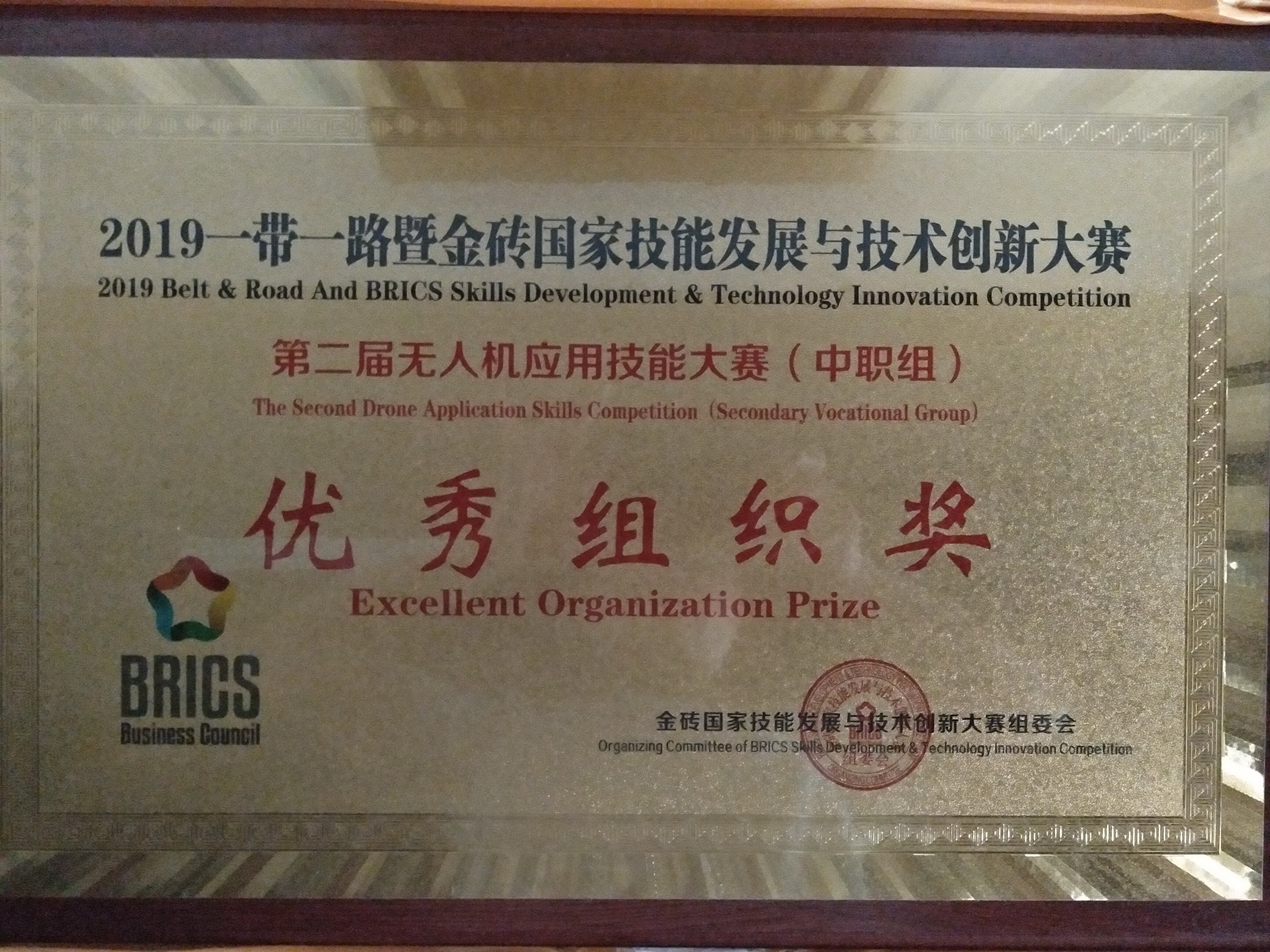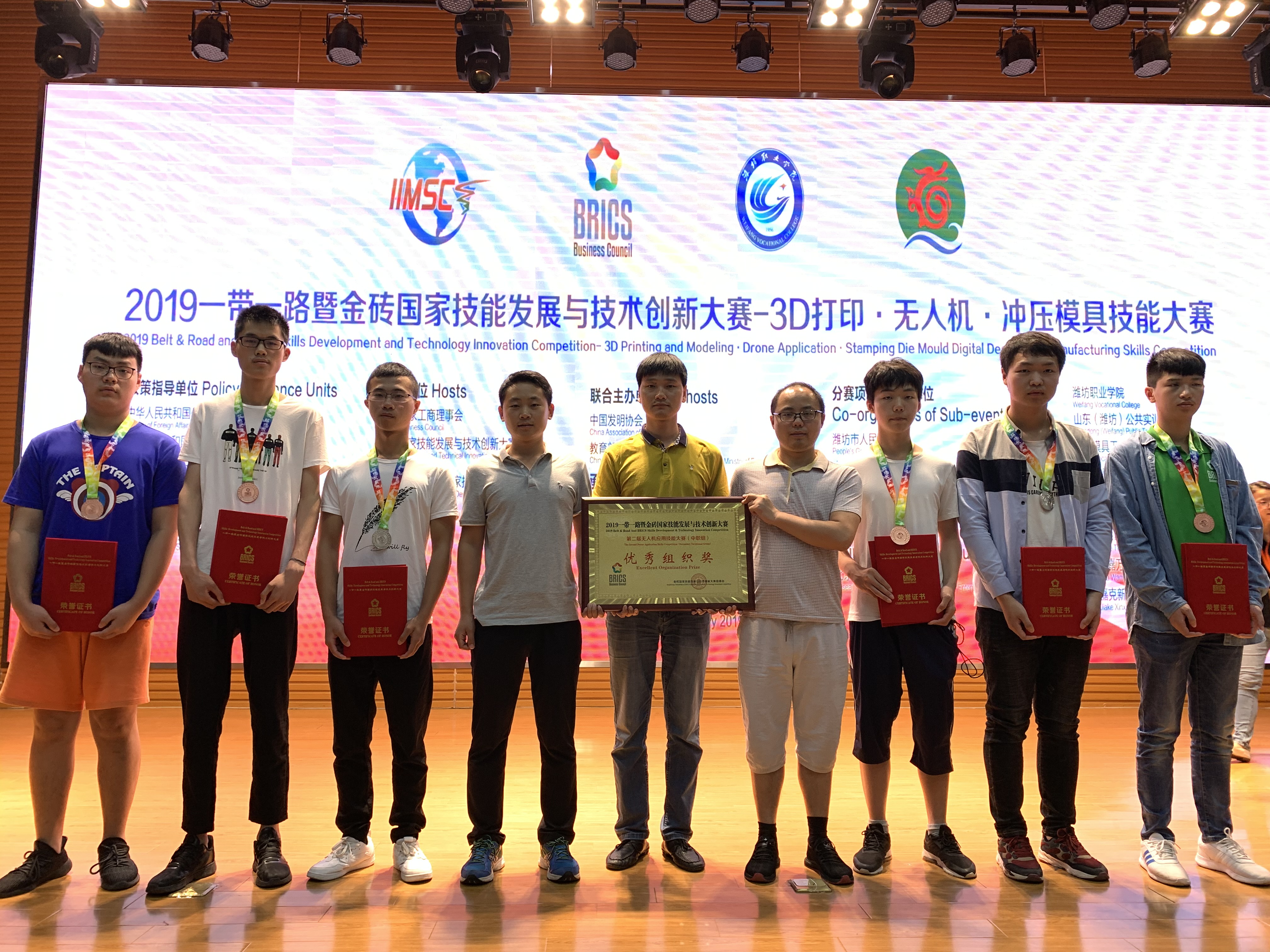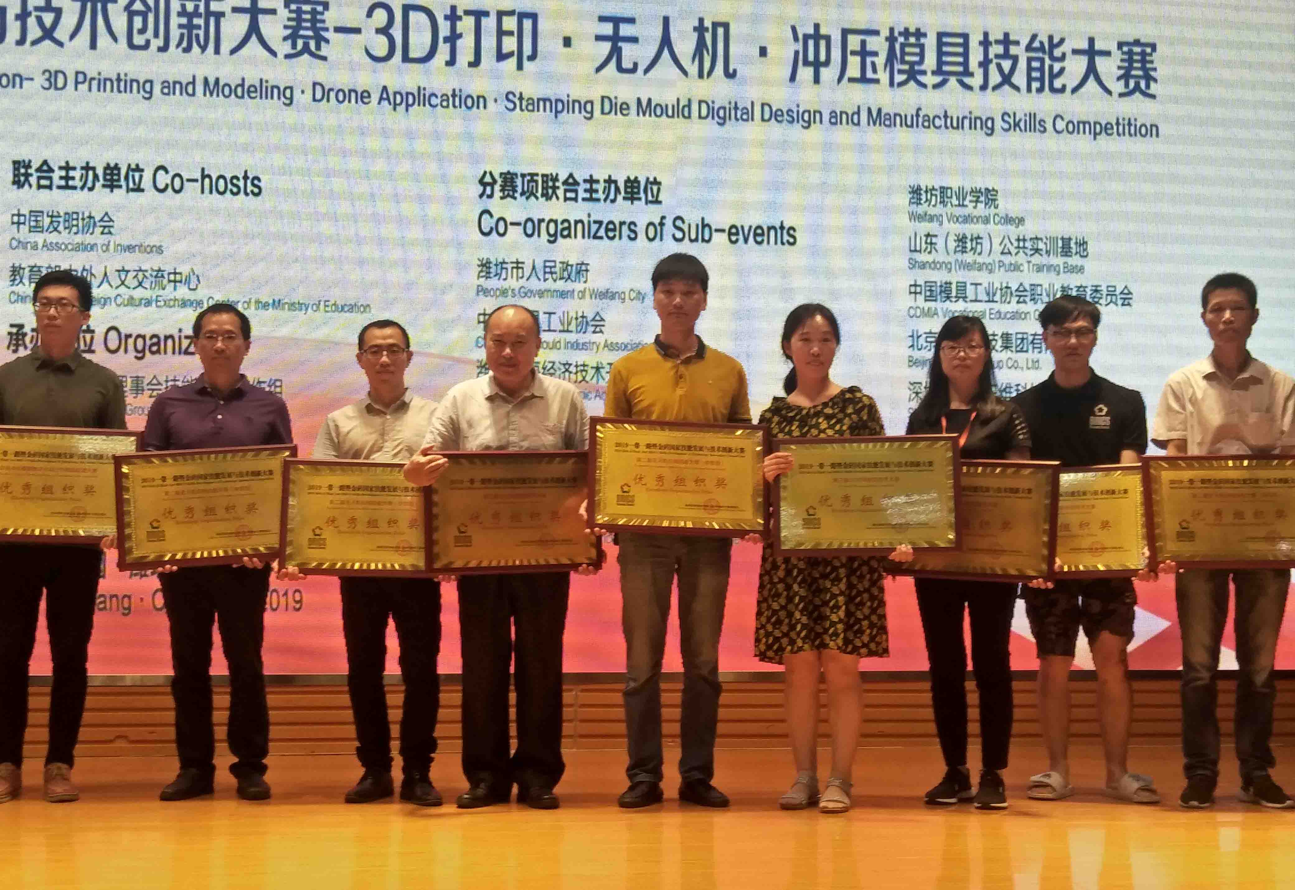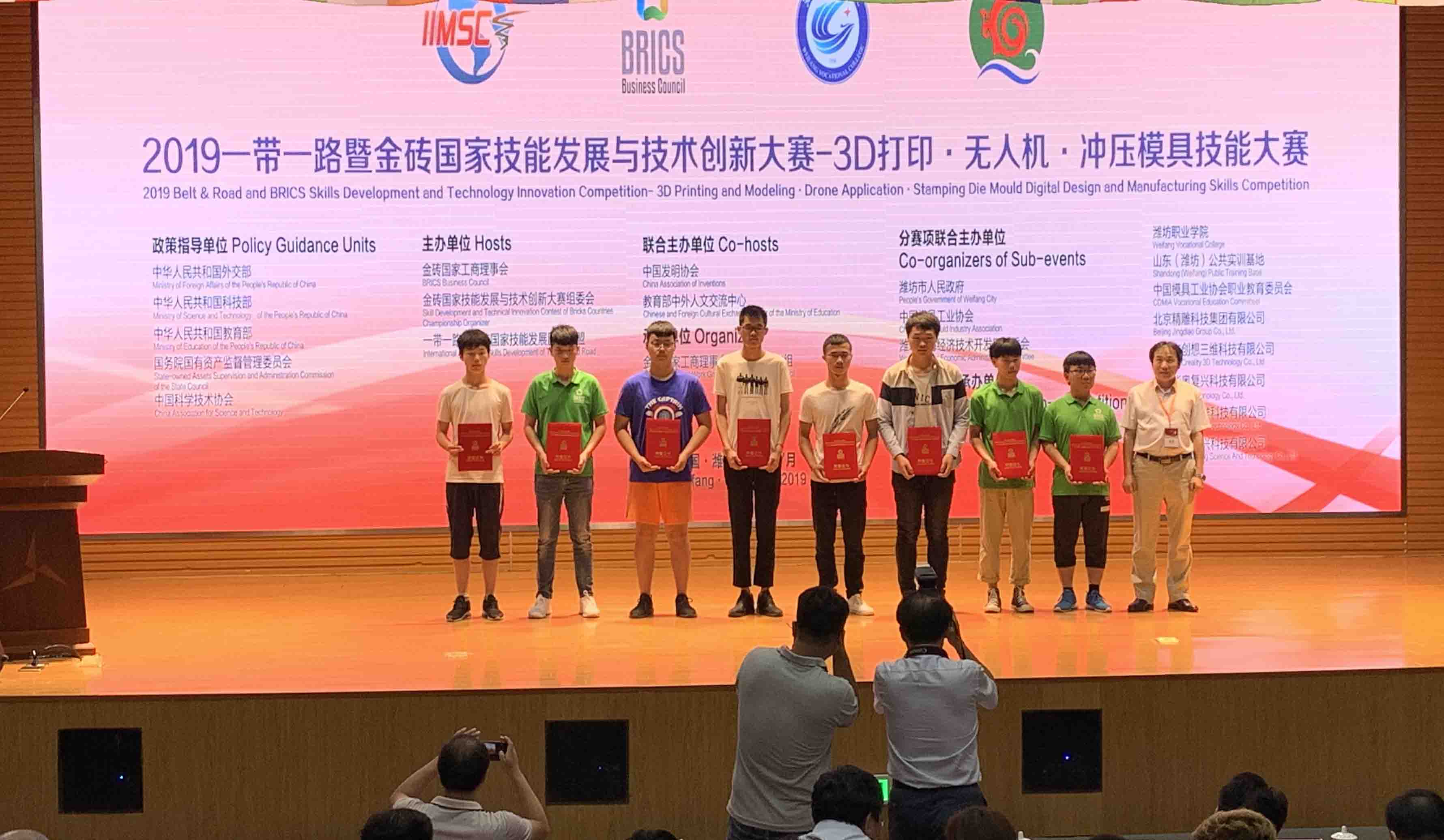 7月8日, 2019年一带一路暨金砖国家技能发展与技术创新大赛—3D打印·无人机·冲压模具技能大赛在山东潍坊闭幕。我院4支队伍8名学生,在经过激烈的比赛后,分别在无人机应用技能赛项国赛中获得1银2铜、在国际赛中获得1银2铜,共6枚奖牌,学院被授予“优秀组织奖”。