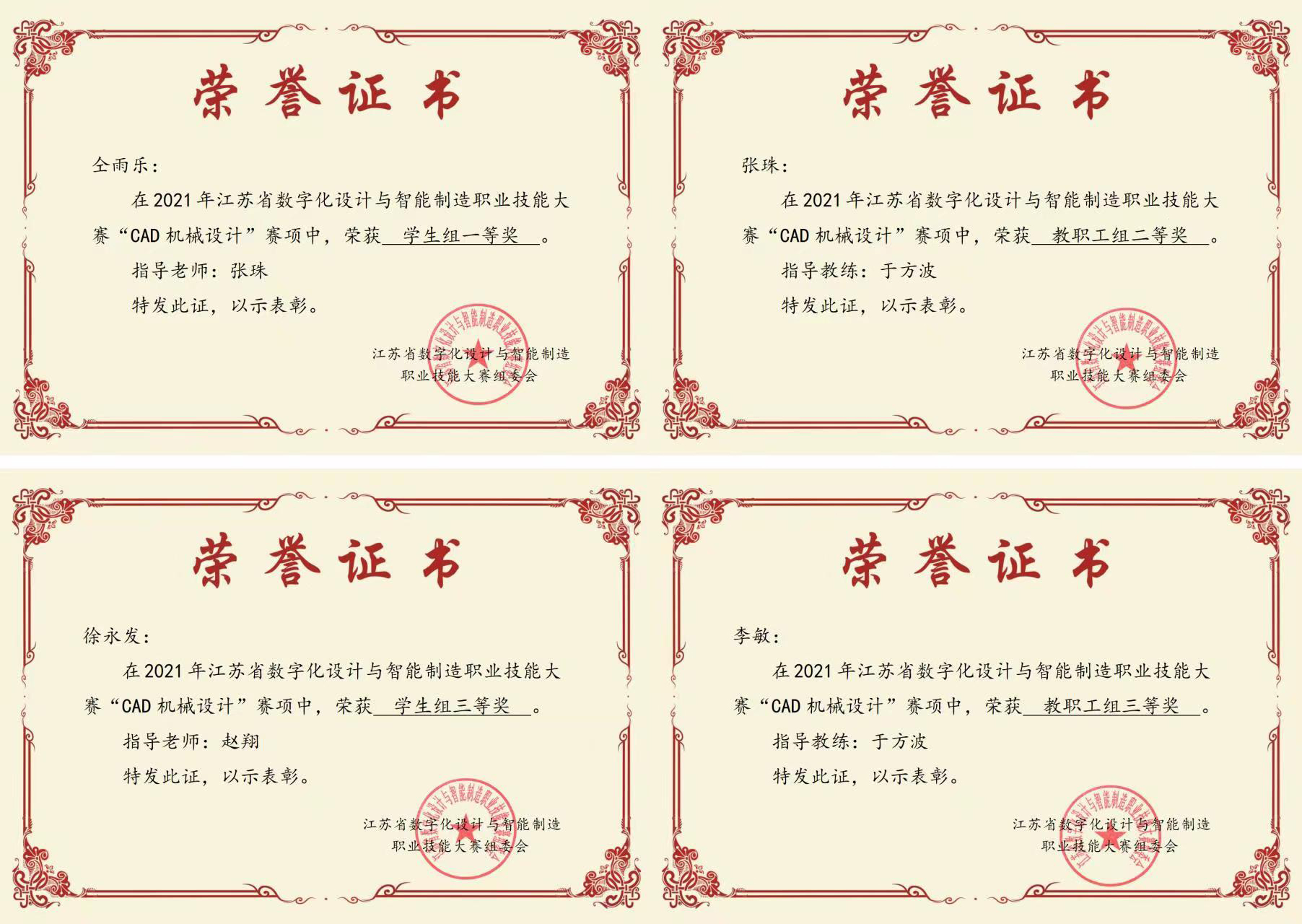 近日,第四届江苏省百万技能人才技能竞赛岗位练兵活动2021年江苏省数字化设计与智能制造职业技能大赛“CAD机械设计”赛项结果公布,我院智能制造系张珠、李敏两位教师分别获得了教职工组二等奖、三等奖,仝雨乐、徐永发两位同学分别获得了学生组一等奖、三等奖。