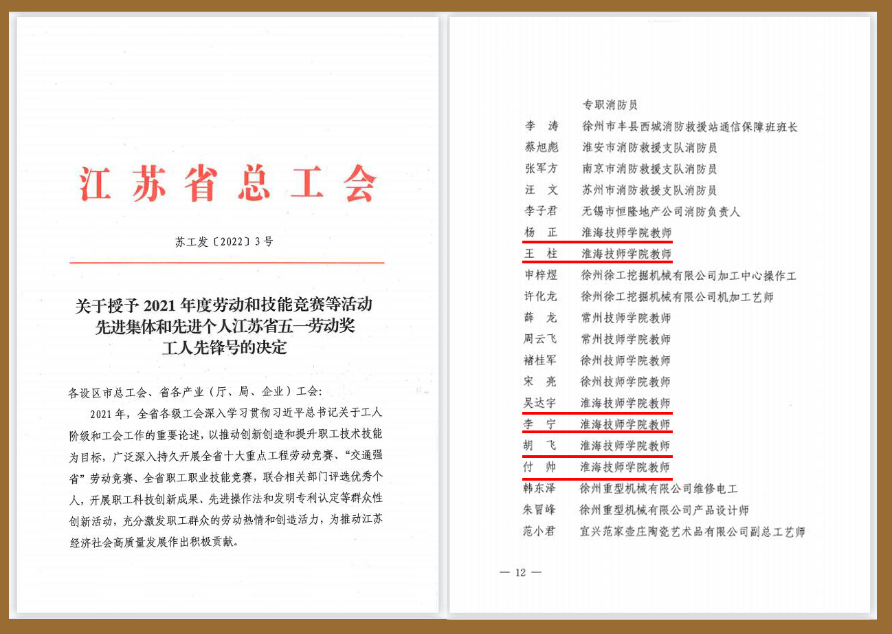 近日,江苏省总工会发布了《关于授予2021年度劳动和技能竞赛等活动先进集体和先进个人江苏省五一劳动奖 工人先锋号的决定》(苏工发〔 2022〕3号)文件,我院王柱、杨正、付帅、胡飞、李宁、吴达宇共六位教师获得“江苏省五一劳动奖章”荣誉称号。
