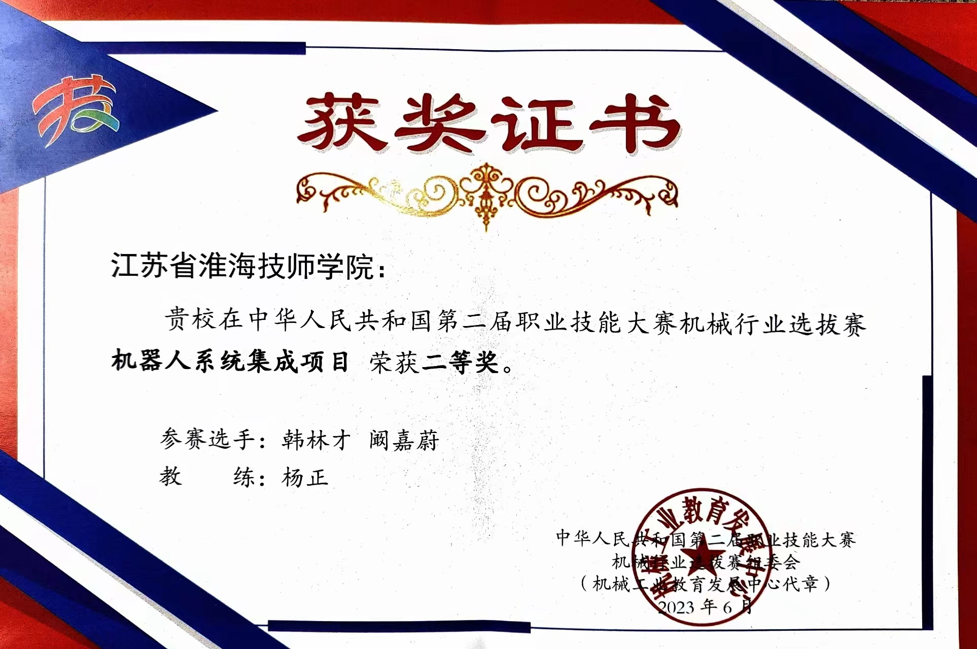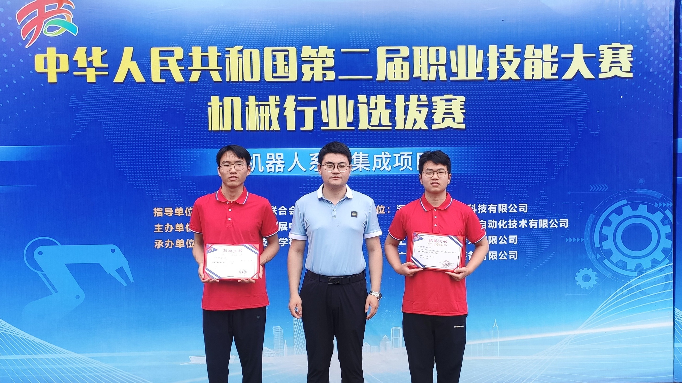 6月15日至17日,中华人民共和国第二届职业技能大赛机械行业选拔赛在广州举行,我院选手韩林才和阚嘉蔚两位同学在机器人系统集成项目中荣获银牌!