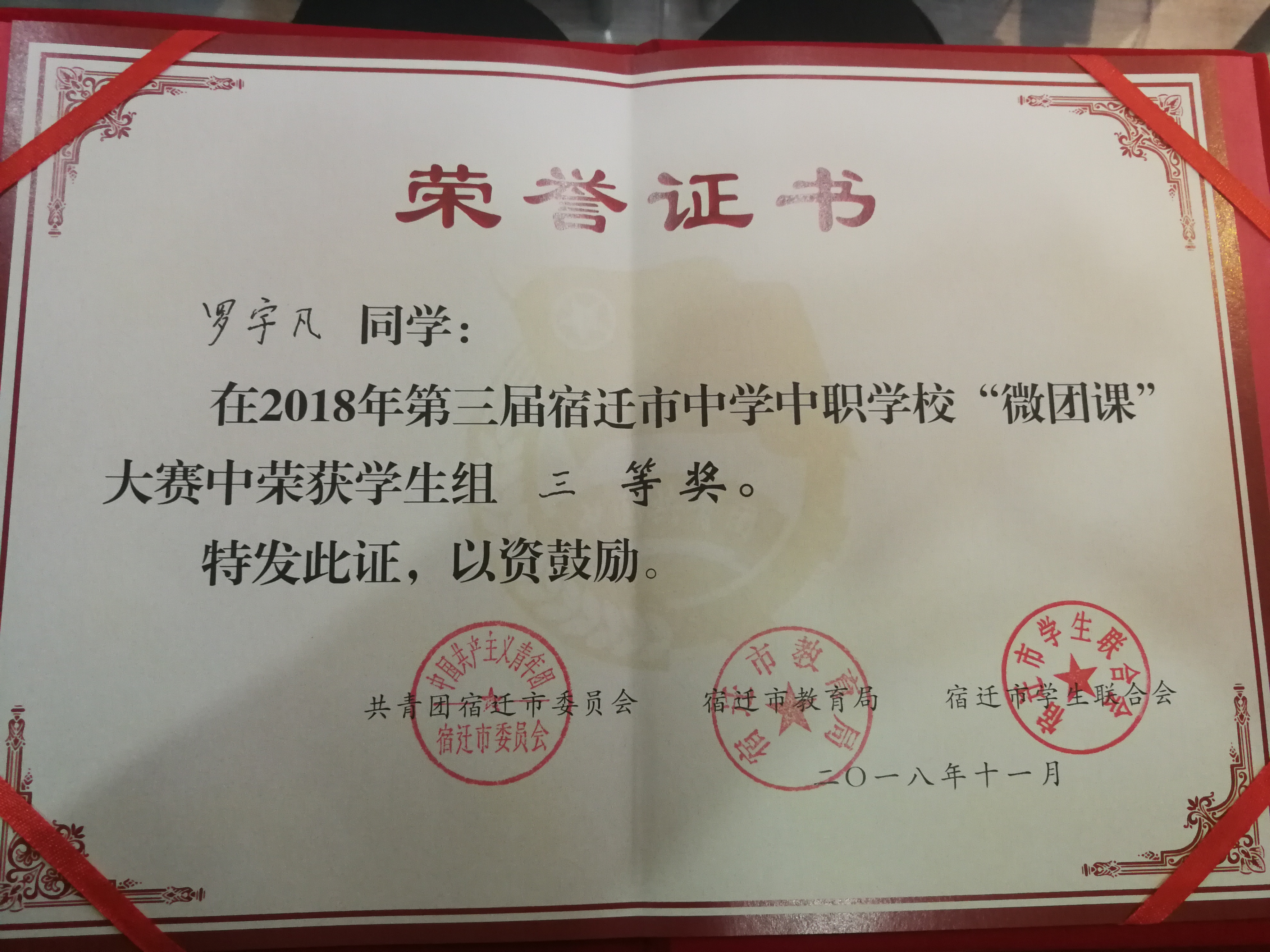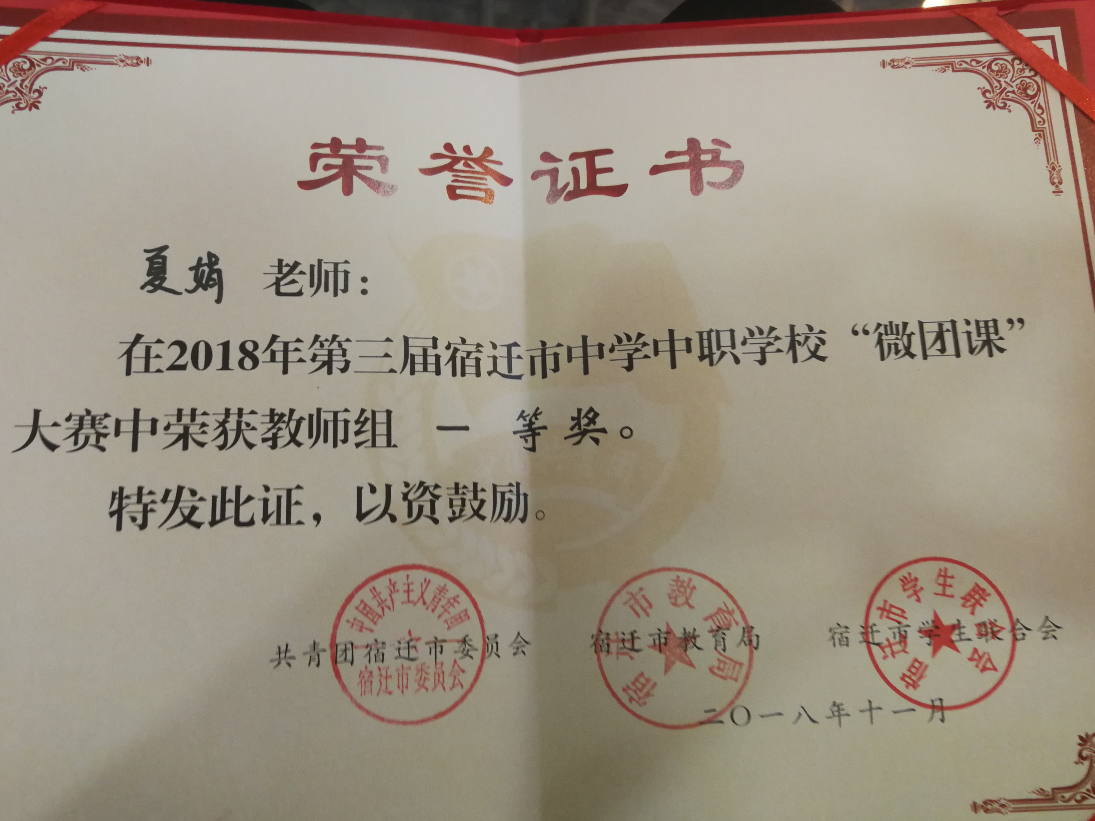 11月9日, 宿迁市第三届中学中职微团课大赛在市马陵中学举行,来自全市40余所中学、中职学校的29名教师以及21名学生参与大赛。我院夏娟老师和电子信息系罗宇凡同学分别参与教师组和学生组比赛。