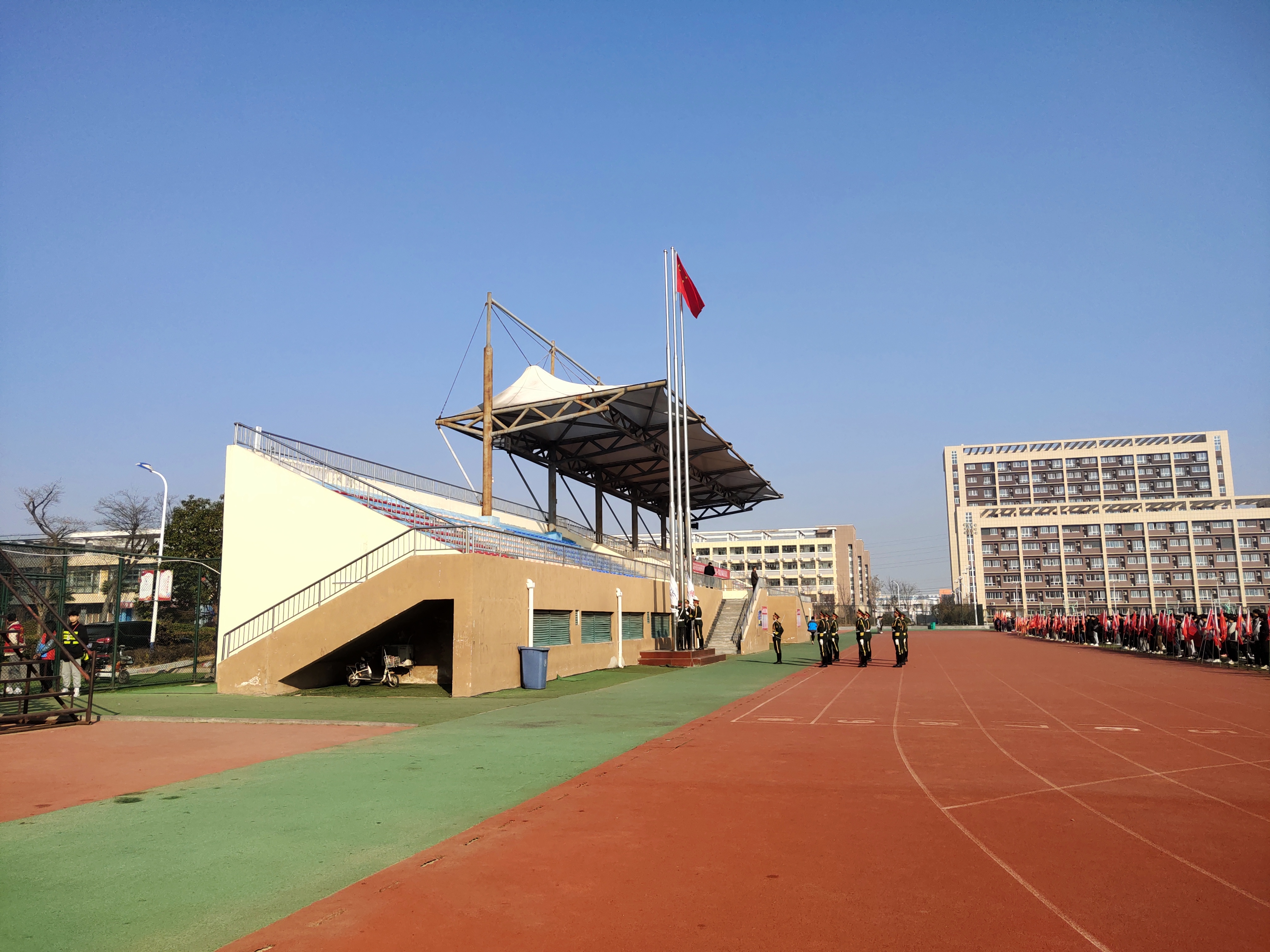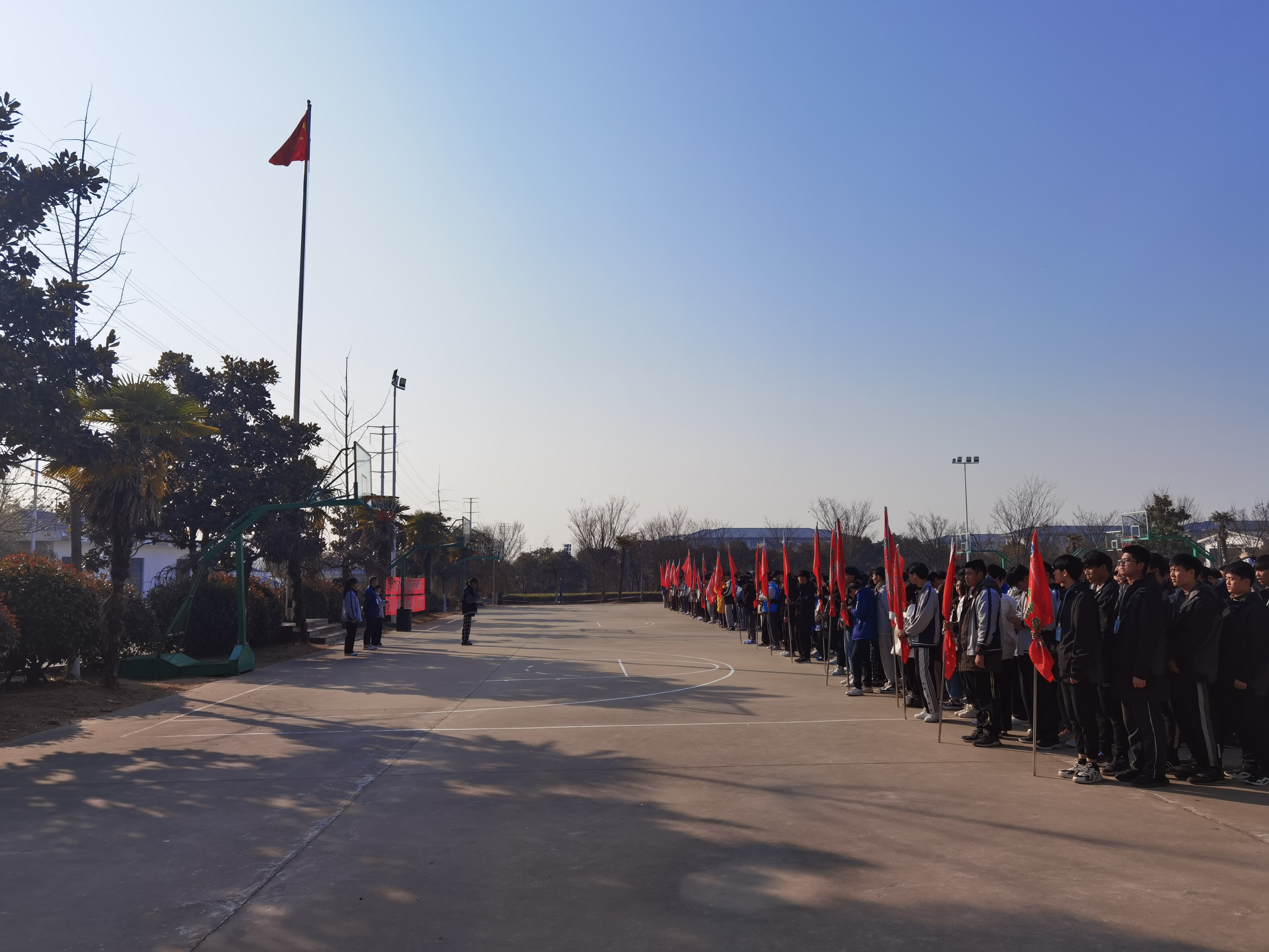 国旗护卫队迈着铿锵的步伐整齐的进入场地,升旗仪式也随之正式开始。伴随国旗手的振臂,鲜艳的五星红旗在国歌伴奏声中升空,全体师生庄严肃立,向国旗行注目礼。