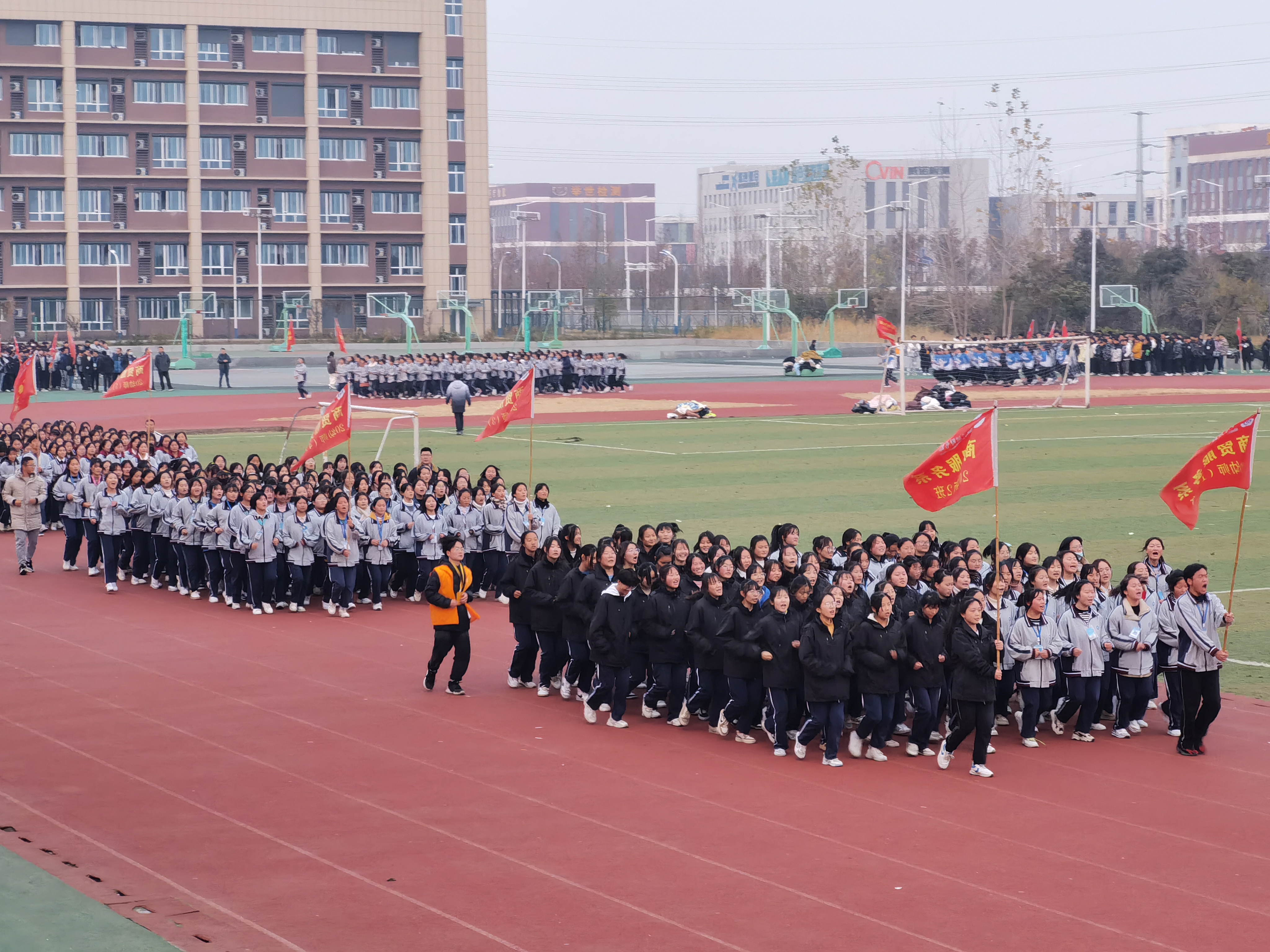 随着体育老师的一声哨响,各个参赛班级在招展的班旗、嘹亮的口号声中有序入场。赛前,各班穿着统一的服装,快速来到田径跑道集中,队列严整、纪律严明。比赛中,各班队形整齐、动作规范、口号响亮、精神饱满,充分展示了同学们勇争上游的决心和奋发向上的精神风貌。