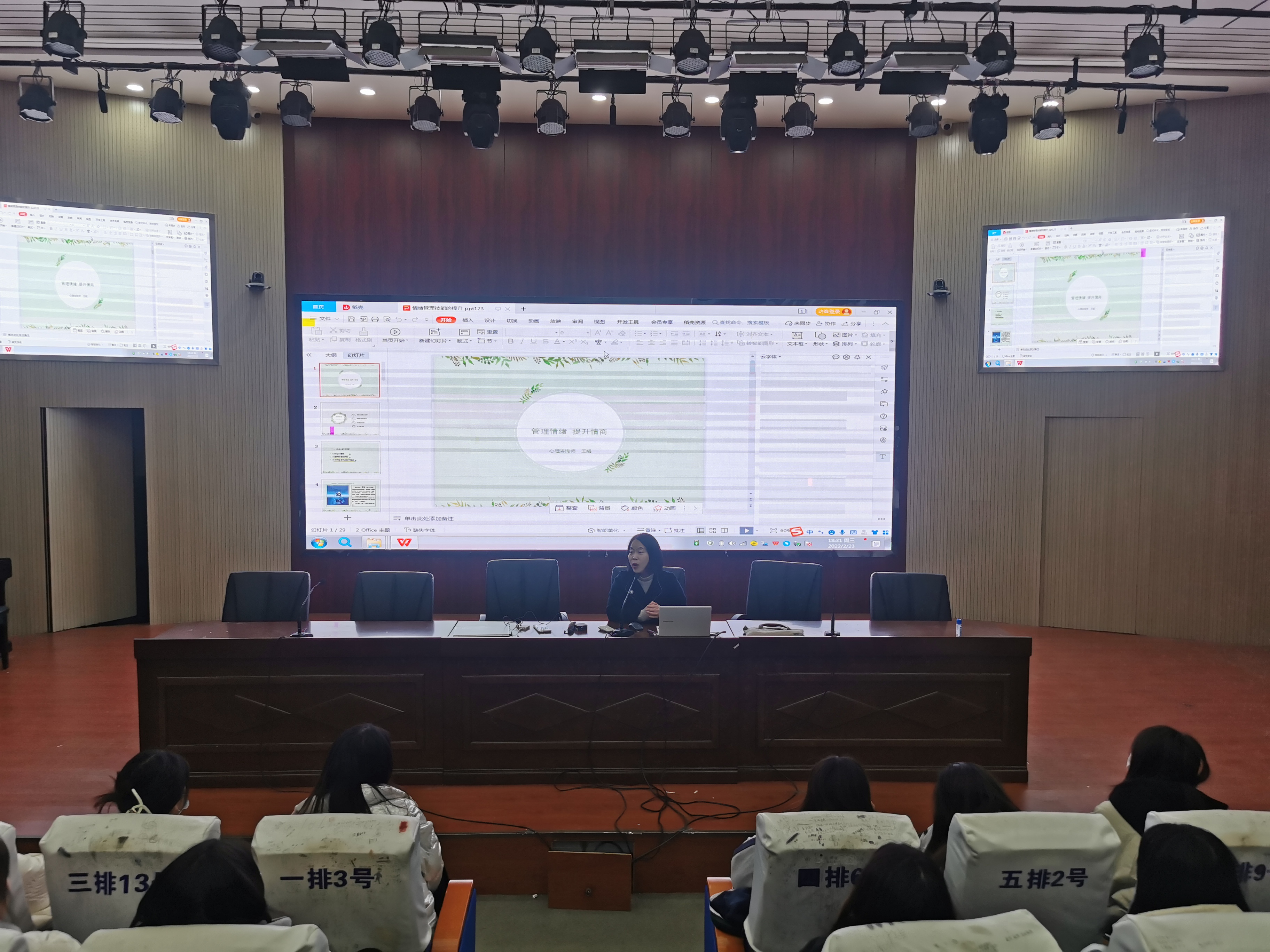 讲座中,王娟老师和同学们交流了情绪和情商之间的关系,通过案例告诉同学们:只有正确合理的掌握自己的情绪,才能提升情商,做高情商的人。活动中老师还带领同学们进行了冥想训练,感受如何掌控自身情绪的变化。