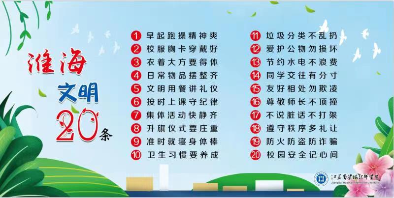下一步,我院将对“淮海文明20条”进行逐条解读,拍摄宣传短片,开展演讲、征文等系列主题活动,让“淮海文明20条”成为学生内化于心、外化于行,日用而不自觉的行为准则,以学生文明推动校园文明,以校园文明助力城市文明,为宿迁建设全国文明典范城市贡献淮海力量。