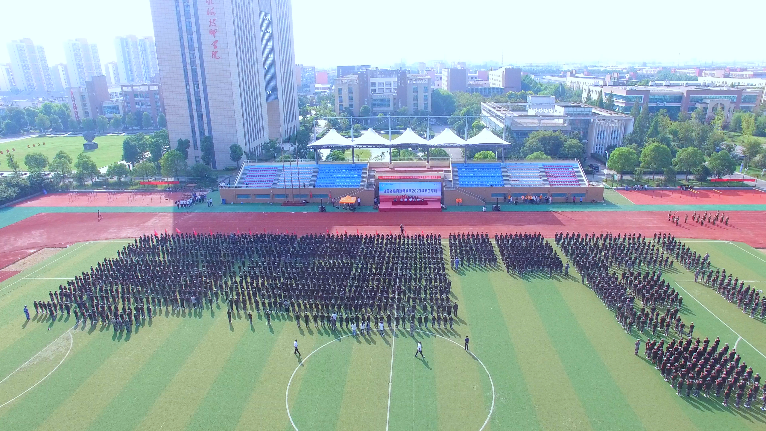沙场点兵正青春,一声号角启新程。9月18日下午,我院2023级新生军训汇演暨总结表彰大会在运动场隆重举行。学院党委书记、院长李军,宿迁军分区动员处处长、市经开区人武办主任吴朝伟,副院长李刚、王坤,纪委书记蔡青出席活动,党委副书记徐守军主持大会。