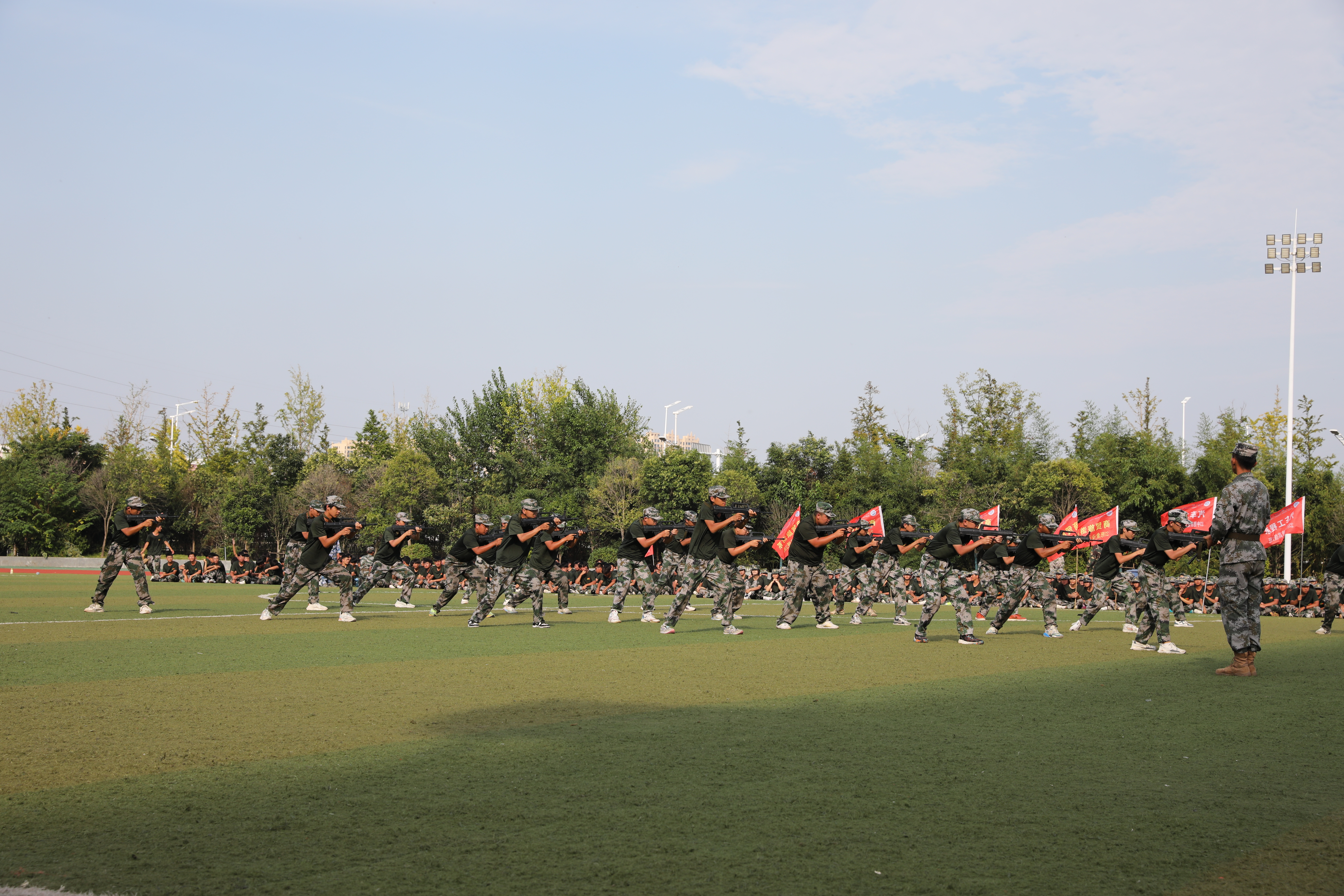 伴随着雄壮的国歌声,鲜艳的五星红旗冉冉升起,2023级新生军训汇报表演正式拉开序幕。踏着分列式进行曲的鼓点,同学们神采奕奕,整齐划一地从主席台前走过,接受检阅。豪迈的军体拳、飒爽的匕首操,在激昂的音乐声中开始了汇报表演。同学们挥洒青春的汗水,动作行云流水,把青春梦融入强军梦强国梦,用奋斗姿态彰显“男儿当自强”的风采,“巾帼不让须眉”的英姿。