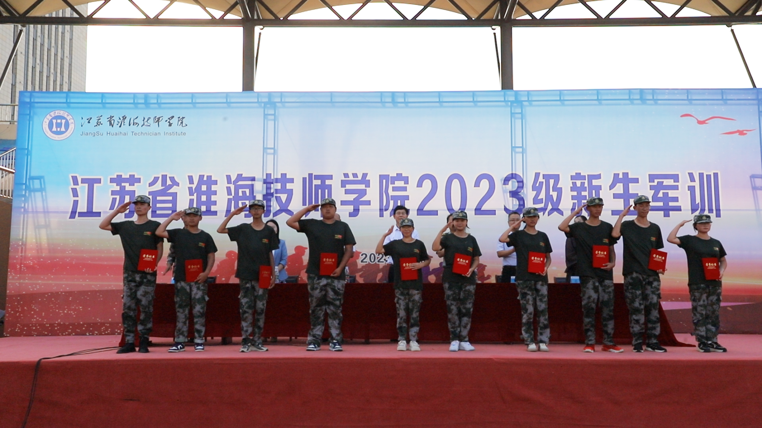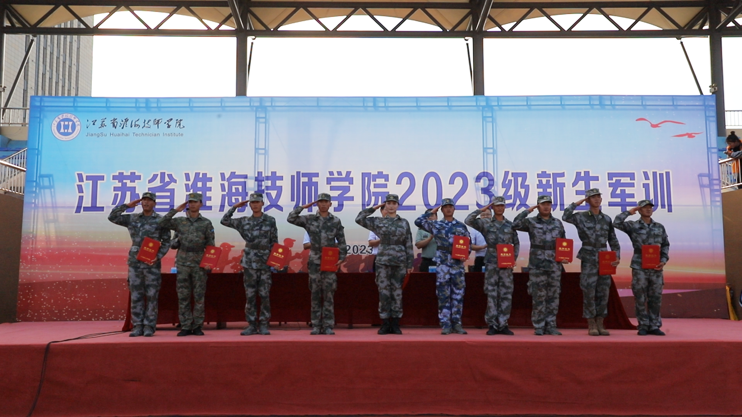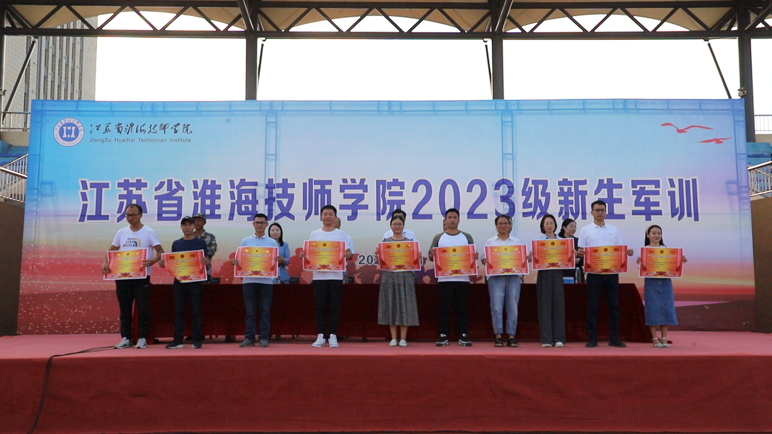 汇报表演结束后,王坤宣读了《关于表彰江苏省淮海技师学院2023年军训先进集体和个人的决定》。与会领导为本次军训中的优秀学员代表、内务标兵代表、优秀教官以及优秀班集体颁发荣誉证书。