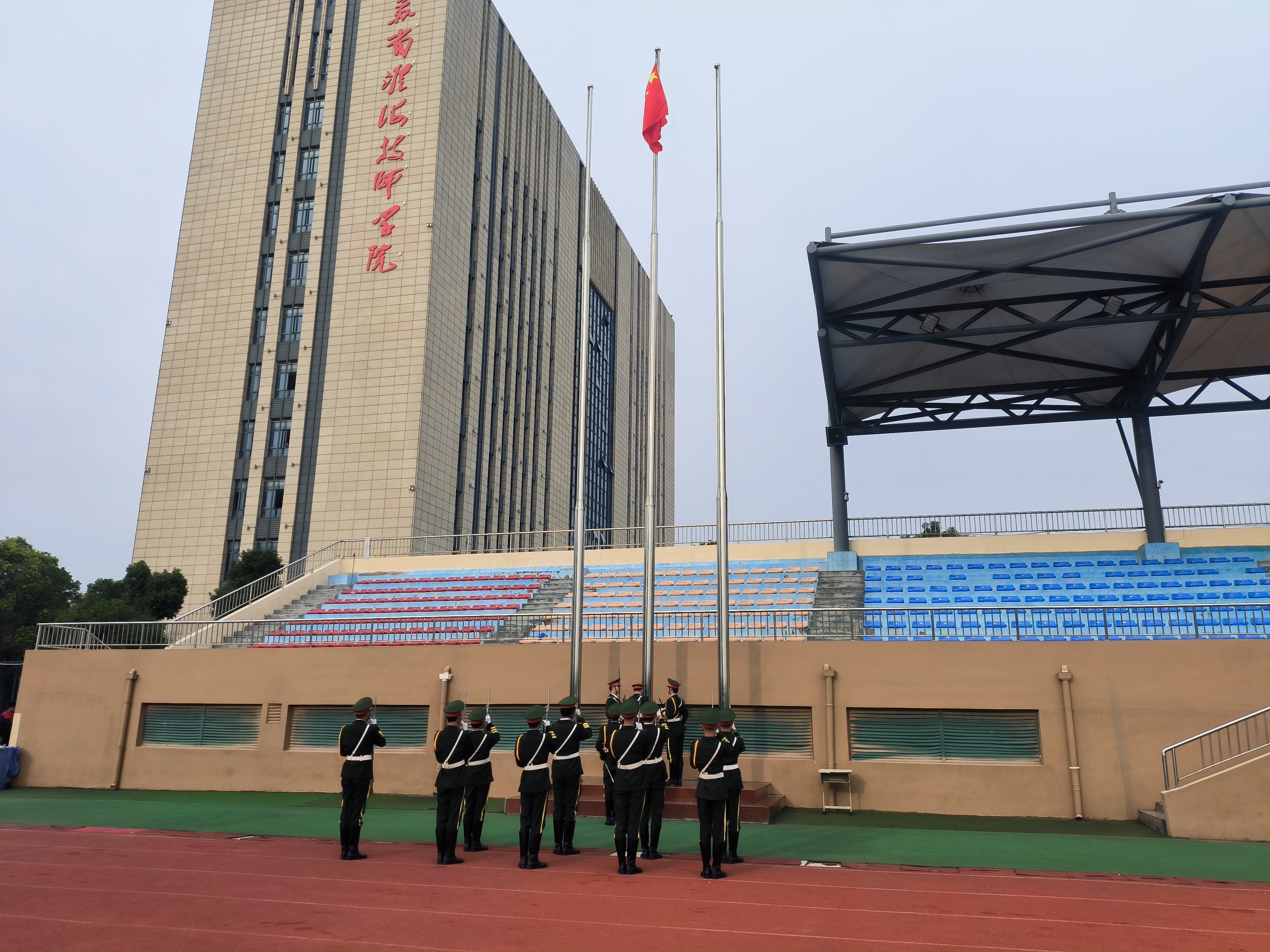 伴随着激昂雄壮的《义勇军进行曲》,鲜艳的五星红旗冉冉升起。全体师生精神饱满,庄严肃立,面向五星红旗行注目礼。
