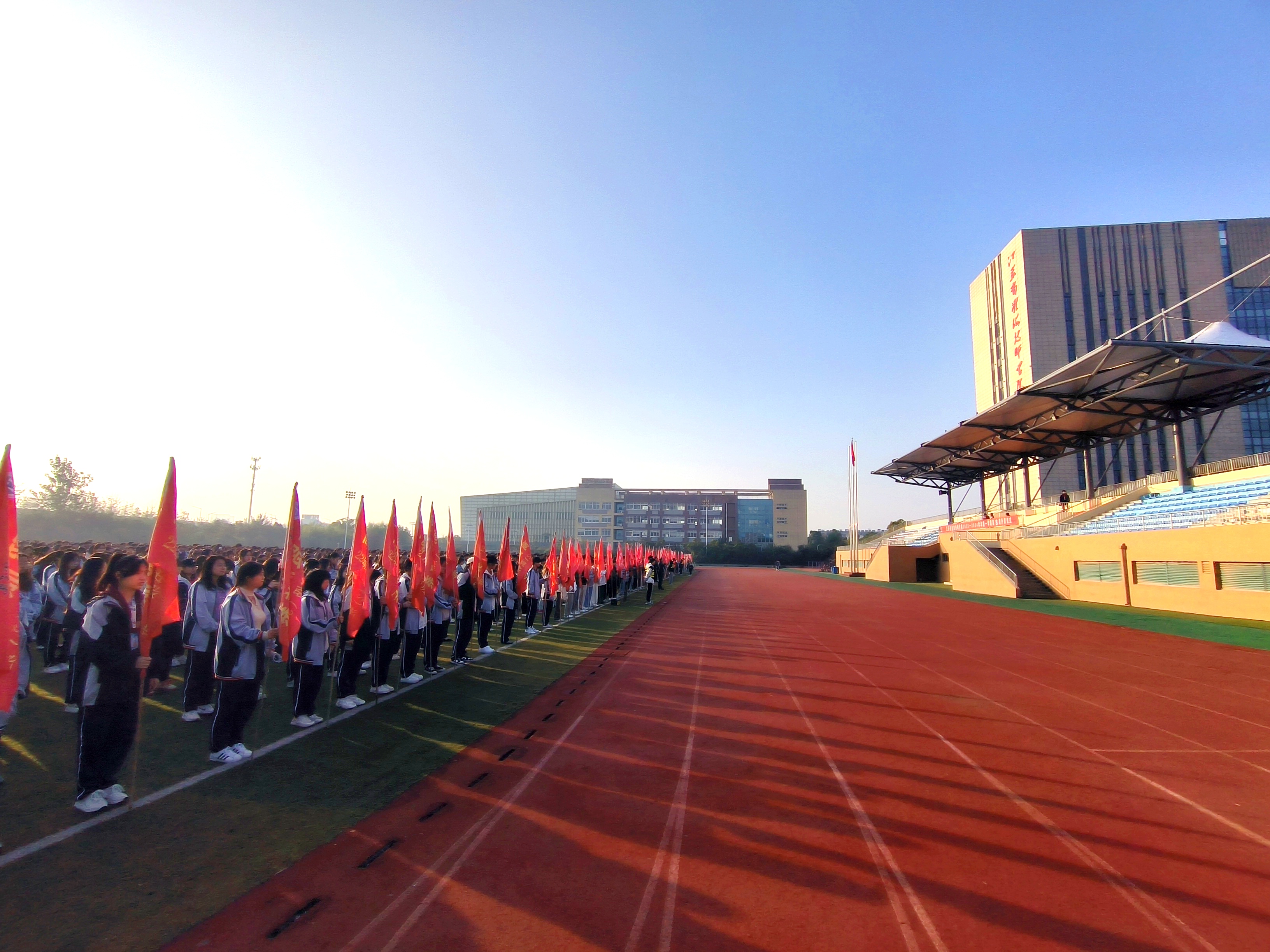 迎着初升的太阳,整齐的队列展示青春的风貌。伴随着庄严的国歌声,五星红旗冉冉升起,迎风飘扬。全体师生满怀敬意,齐唱国歌,凝视五星红旗。