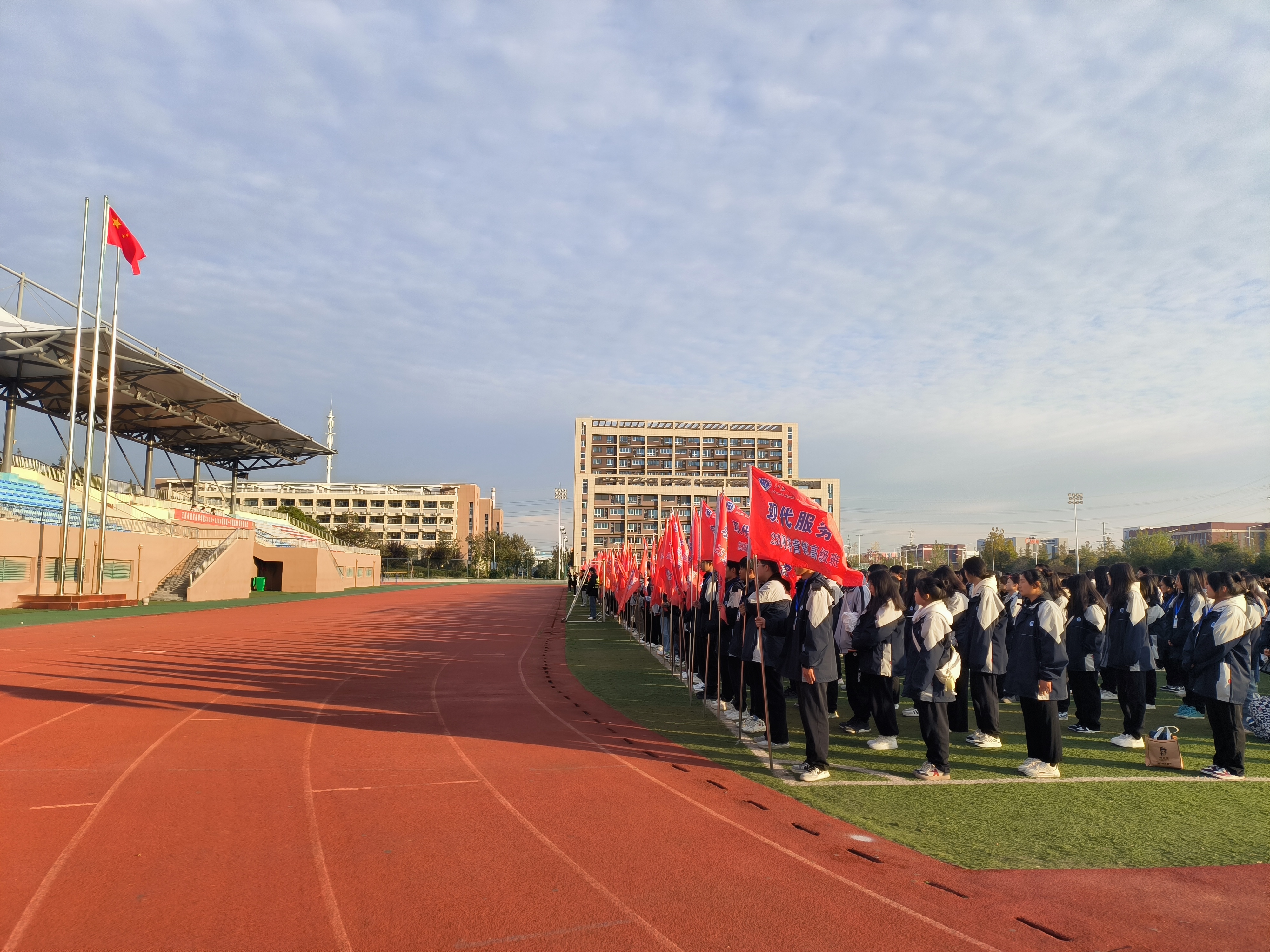 伴随着清晨的朝阳,国旗护卫队迈着整齐的步伐入场,全体师生齐唱国歌,鲜艳的五星红旗冉冉升起,迎风飘扬。