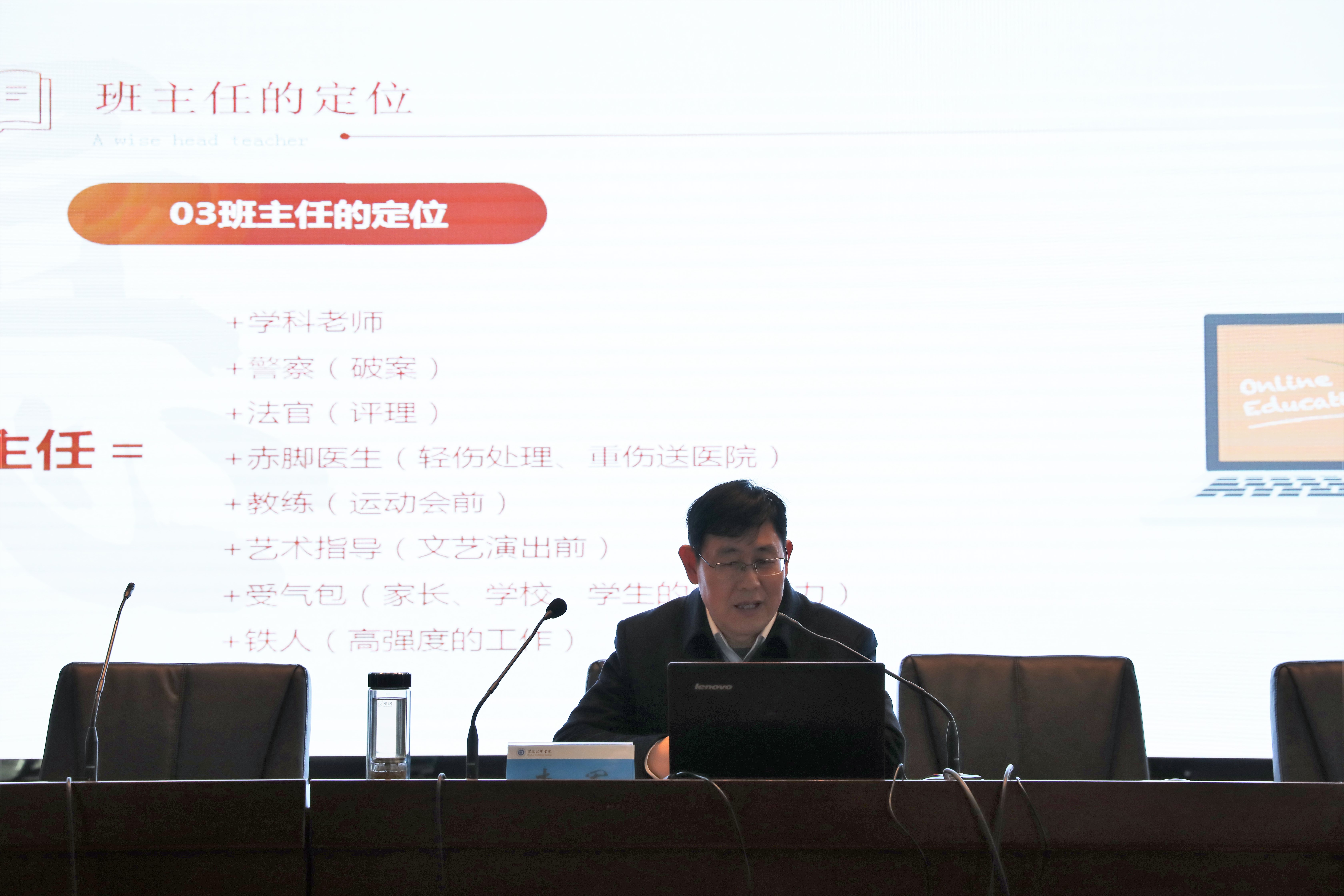 李军在《做有温度的技工院校班主任》授课中,结合学院班主任工作实际情况,围绕班主任的定位、学生管理过程中的难点、怎样做好班主任工作等三个方面和大家展开交流。李军充分肯定了学院班主任工作成效,并从技工院校班主任的多重角色切入,指出了班主任的角色定位。他认为大家是最小的“主任”,是最基层的学生管理者,是学生在校期间的“主心骨”,是学生思想上的“引路人”,在日常学生管理过程中,一定要明确自身的角色定位,关注自身言行对学生的影响。