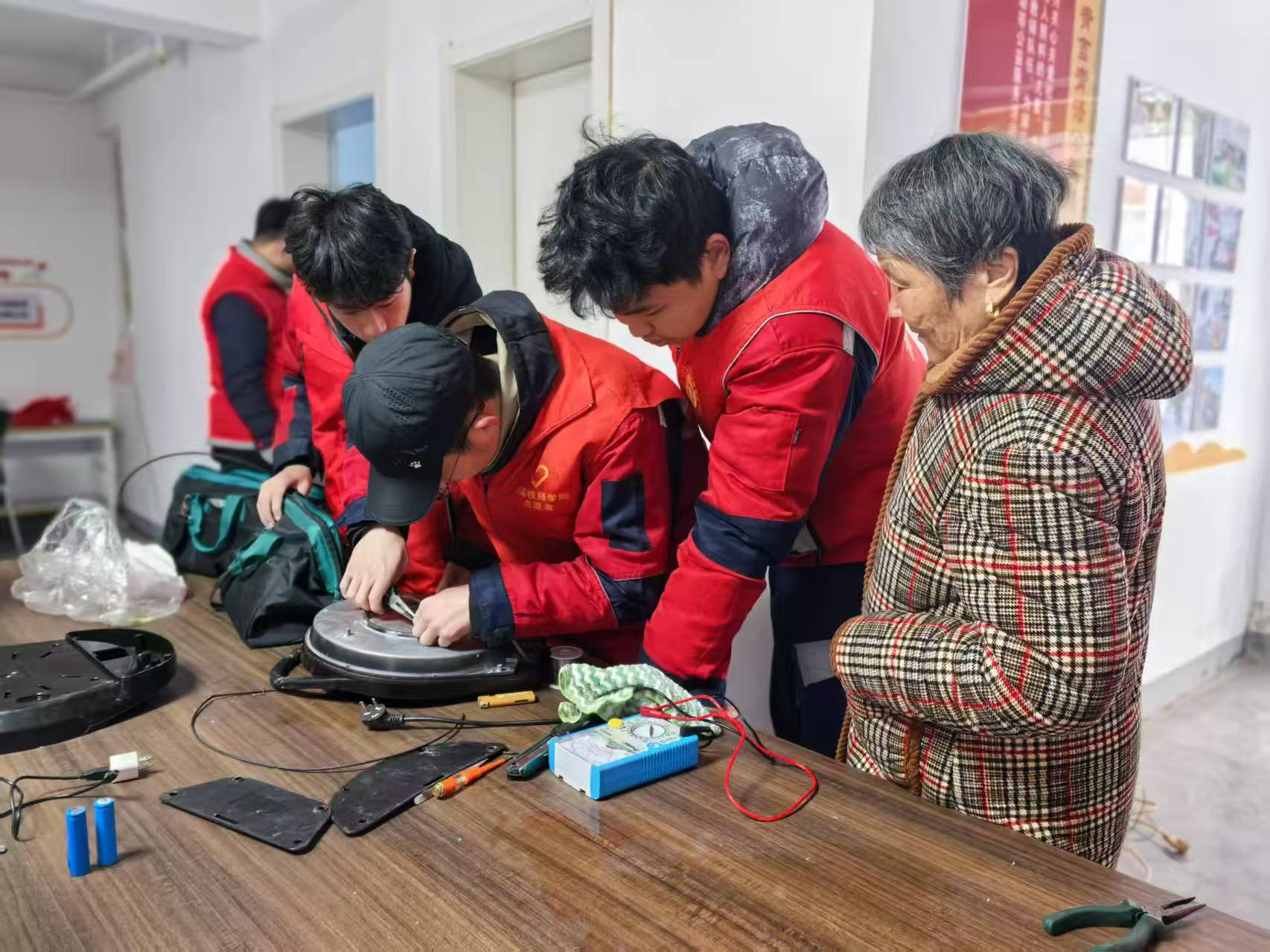 在王梨园社区,机电专业的学生们化身为家电维修小能手,为社区居民提供了贴心的家电维修服务。他们运用所学专业知识,耐心细致地检查并维修了各类小家电,从收音机、电水壶到电风扇、电视机,无一不体现出他们的专业水准和敬业精神。居民们纷纷表示,这些学生们的到来解决了他们的燃眉之急,让他们感受到了实实在在的帮助和温暖。