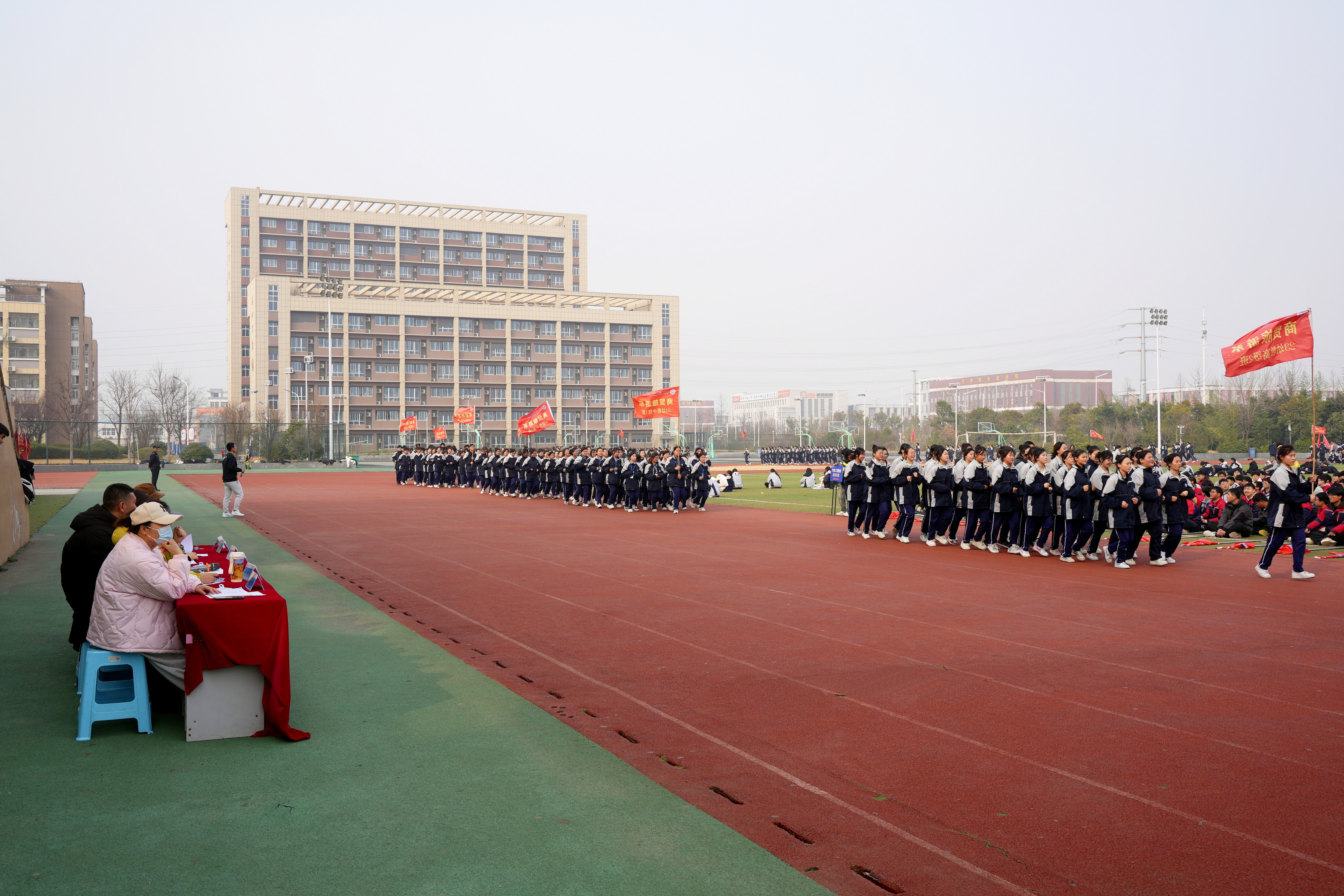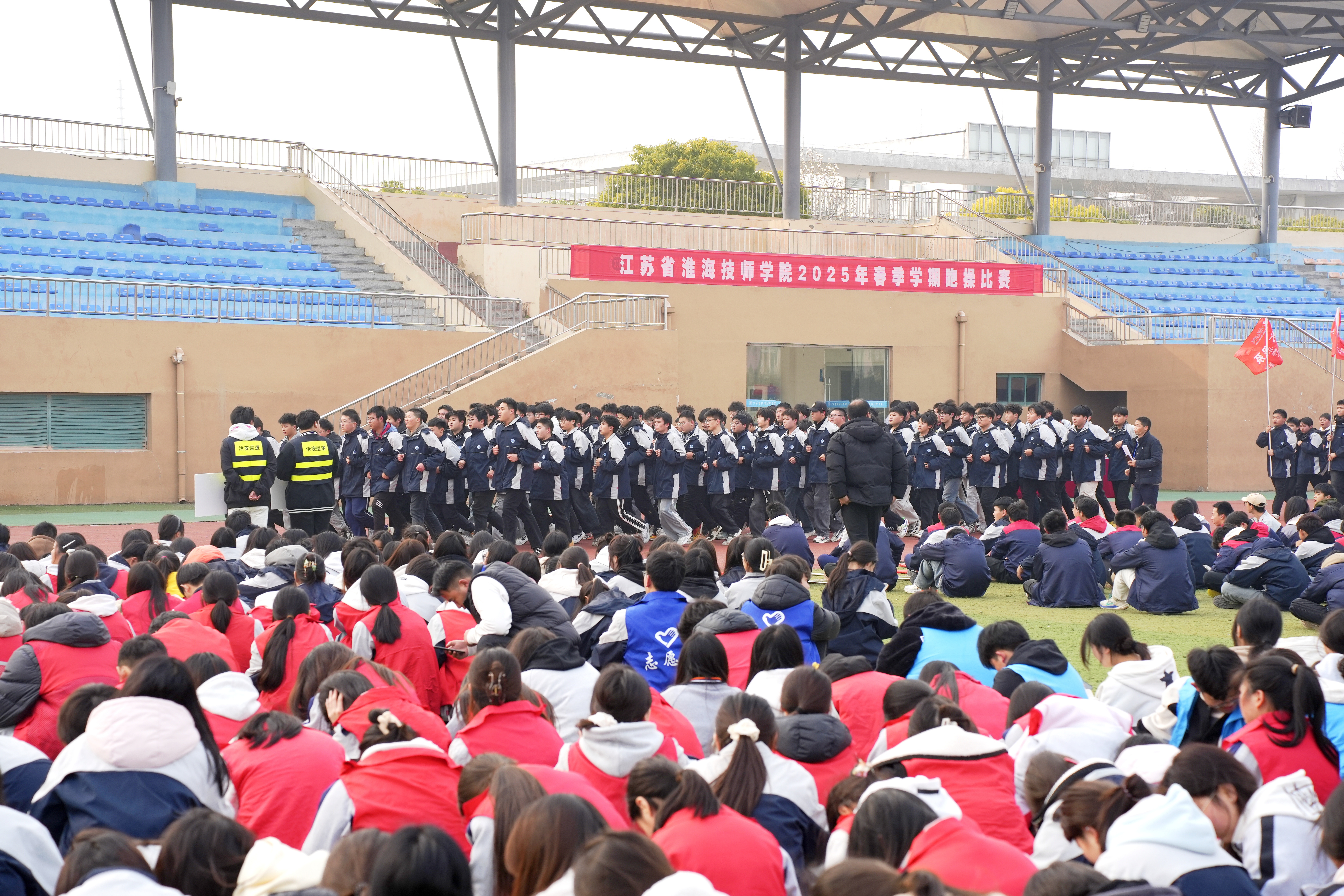 随着激昂的音乐旋律,各班级方阵依次入场。同学们身着整齐的校服或工装,精神抖擞地排列在跑道上。哨声响起,大家迈着矫健有力的步伐,如同一股股涌动的浪潮,有序前行。他们身姿挺拔,摆臂整齐划一,步伐坚定有力,充分展现出淮海学子团结奋进、积极进取的团队精神和个人素质。