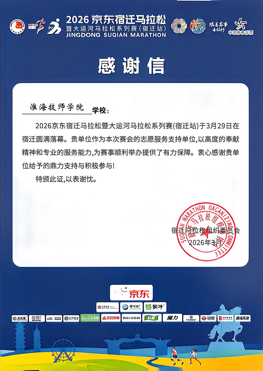 3月29日,京东宿迁马拉松暨大运河马拉松系列赛(宿迁站)在宿迁圆满收官。我院作为赛事的志愿服务支持单位,凭借高度的奉献精神与专业的服务能力,为赛事顺利举办提供了坚实保障,获宿迁马拉松组织委员会发来感谢信。
