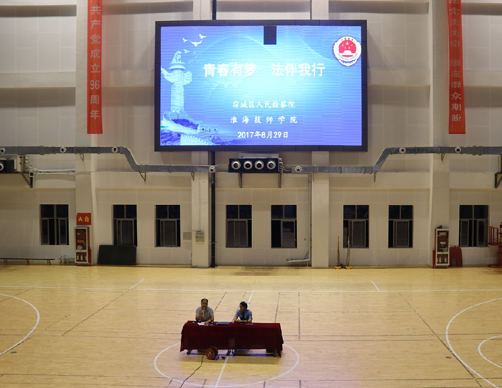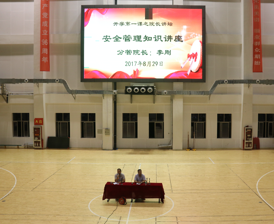8月29日晚上,我院邀请宿城区人民检察院未成年人检察科科长郭健在体育馆举办安全管理知识讲座。学院院委成员、培训处处长李刚,各系部及相关处室负责人,新生班主任、2017级全体新生参加了本次讲座。讲座由学工处负责人王言明主持。