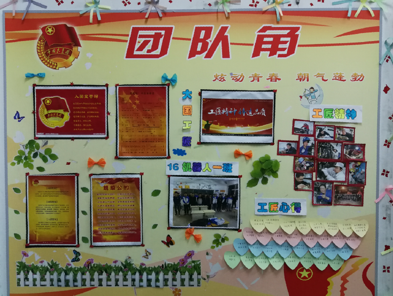 为了加强班级支部共青团组织建设,团委于上一学年在各班级团支部组织开展“班级团队角”建设活动,并定期设置主题进行检查、评比。为了契合近段时间的主题文体活动,本次团队角主题为“我们是未来的大国工匠”。旨在通过这一主题,在全院范围内宣传“工匠精神”,营造自信、自强的校园氛围。通知下发以后,各班级支部积极行动,通过图片、手抄报等形式展现这一主题。不少班级还创造性的利用各种身边素材,丰富本期“团队角”的内容。