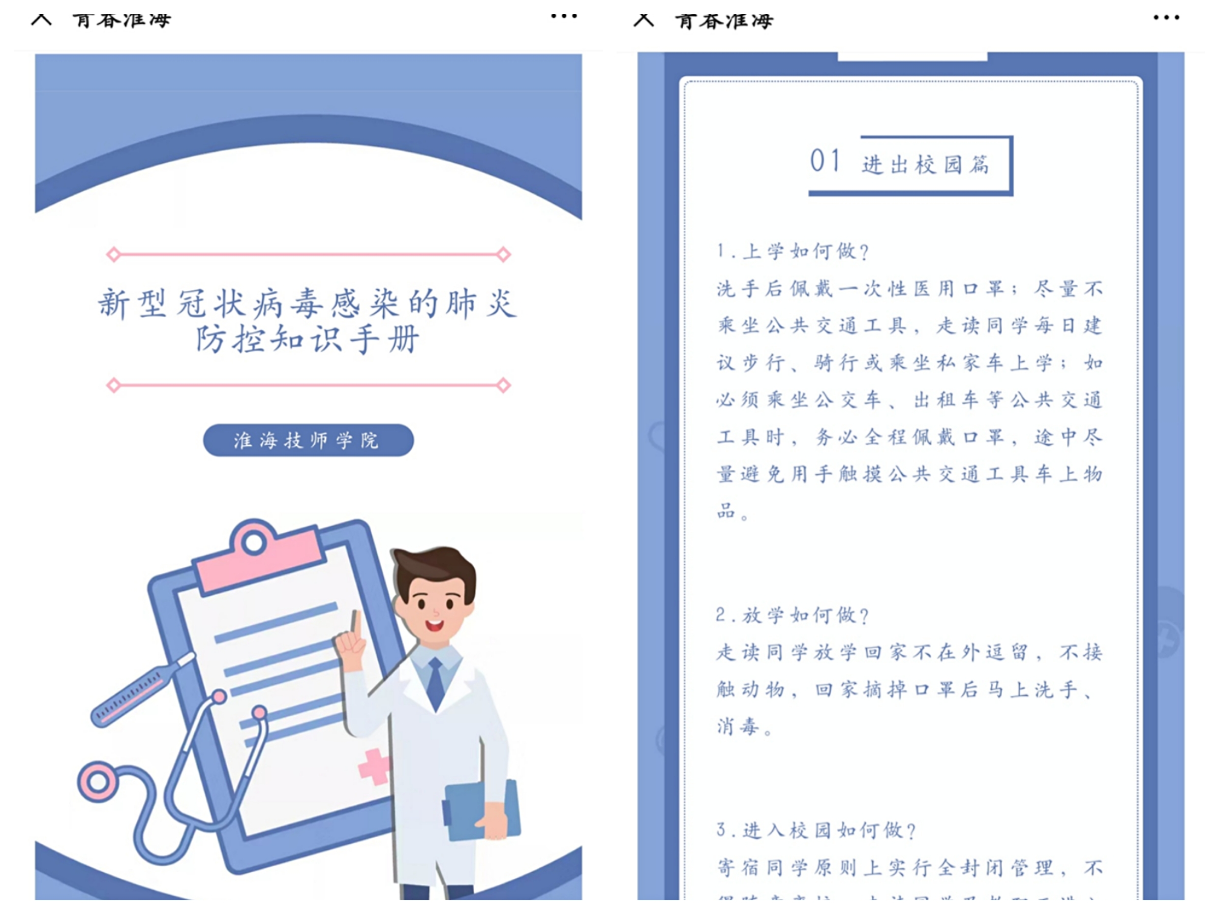 目前,新型冠状病毒感染的肺炎疫情防控工作处于关键时期,为切实做好疫情应对,指导学院各相关部门、系部、班级科学有序开展疫情防控工作,特别是保障全体师生开学后正常有序的开展工作学习活动,由学院疫情防控应急工作领导小组指导编制的《淮海技师学院新型冠状病毒感染的肺炎防控知识手册》日前正式发布。《手册》从“进入校园”、“学生教育”、“学生活动”、“教职工办公”以及“校园防控”等5个方面分31个注意事项详细介绍了如何科学防控疫情。